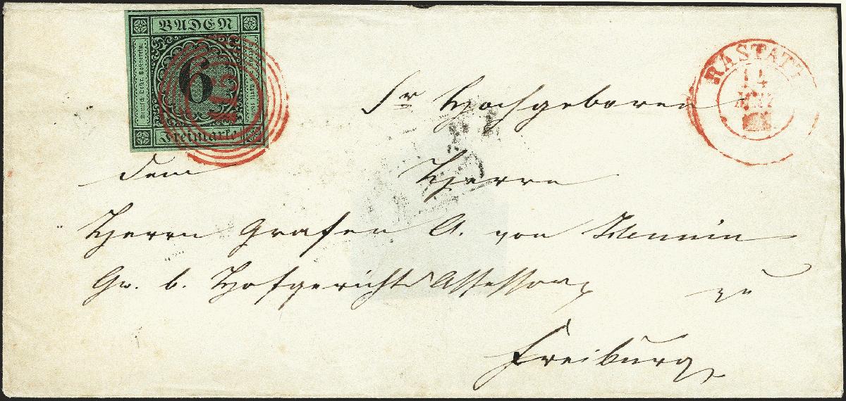| Zusatzinformationen und Suchstichworte: | 377. Auktion Heinrich Köhler 20. - 25. September 2021 Los 6 6 Kreuzer schwarz auf gelbgrün, sehr schön farbfrisch und breit- bis überrandig geschnitten, mit sauber aufgesetzter roter Nummer "115" und nebengesetztem roten Doppelkreisstempel "RASTATT 14 MRZ." auf Briefkuvert (rückseitiges Siegel ausgeschnitten) nach Freiburg. Ein attraktiver Brief in sehr schöner Erhaltung. Fotoattest Stegmüller BPP (2021) Ausruf 200,00 EUR Zuschlag 560,00 EUR (aus der Sammlung Erivan Haub) |