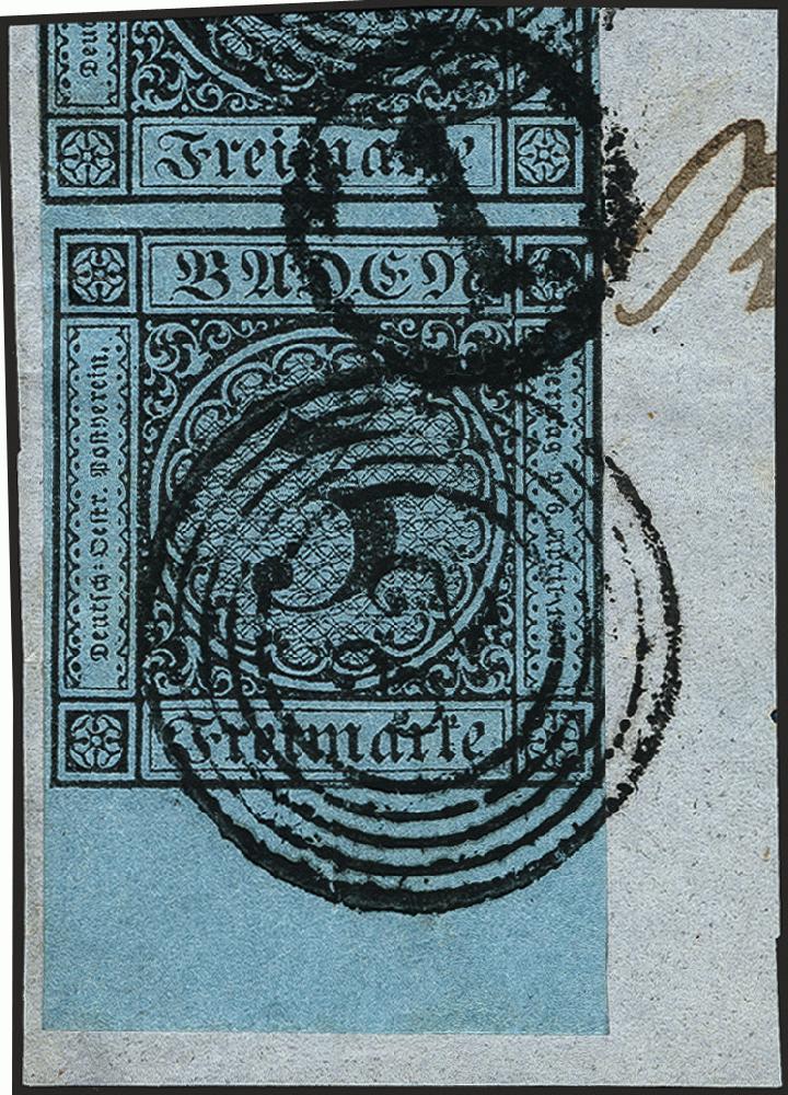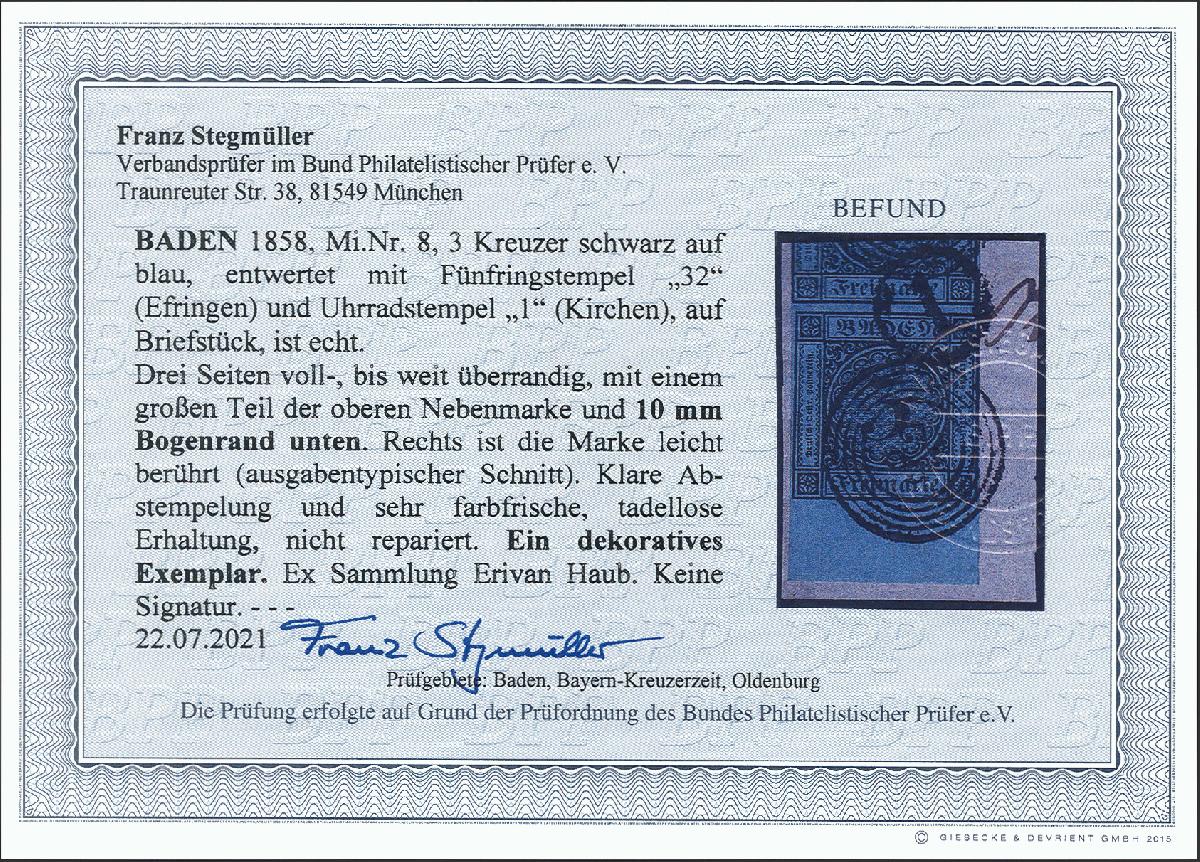 | Zusatzinformationen und Suchstichworte: | 377. Auktion Heinrich Köhler 20. - 25. September 2021 Los 10 1858, 3 Kreuzer schwarz auf blau, Unterrandstück, oben rechts leicht berührt, sonst voll- bis überrandig, oben mit großem Teil der Nachbarmarke und unten mit ca. 10 mm Bogenrand, mit schöner Doppelentwertung durch Nummer "32" IFRINGEN und Uhrradstempel "1" KIRCHEN auf Briefstück, tadellos. Fotobefund Stegmüller BPP (2021) Ausruf 80,00 EUR Zuschlag 400,00 EUR (aus der Sammlung Erivan Haub) |