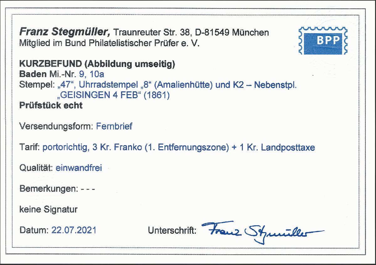 | Zusatzinformationen und Suchstichworte: | 377. Auktion Heinrich Köhler 20. - 25. September 2021 Los 13 1 Kreuzer schwarz und 3 Kreuzer preußischblau, farbfrisch und gut gezähnt mit über beide Werte gehendem Uhrradstempel "8" AMALIENHÜTTE, die 3 Kreuzer mit zusätzlicher Nummer "47" auf Faltbrief mit nebengesetztem Doppelkreisstempel "GEISINGEN 4 FEB" (1861) nach Stockach. Ganz leichte Patina, sonst einwandfrei. Kurzbefund Stegmüller BPP Ausruf 80,00 EUR Zuschlag 360,00 EUR (aus der Sammlung Erivan Haub) |