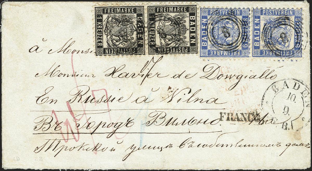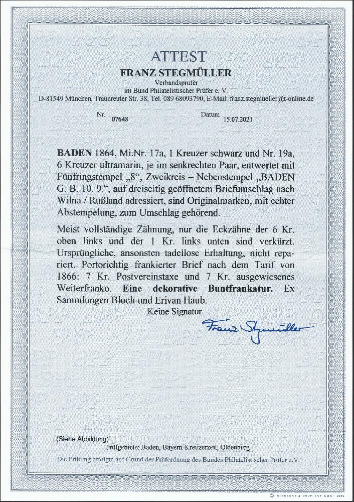 | Zusatzinformationen und Suchstichworte: | 377. Auktion Heinrich Köhler 20. - 25. September 2021 Los 15 1864, 1 Kreuzer schwarz und 6 Kreuzer ultramarin, jeweils im senkrechten Paar, farbfrisch und bis auf 2 verkürzte Eckzähne einwandfrei gezähnt, mit Nummer "8" und nebengesetztem Doppelkreisstempel "BADEN G.B. 10.9." auf Briefkuvert nach Vilnius im russischen Kaiserreich (heute Litauen). Der Brief ist nach dem Tarif von 1866 portogerecht frankiert mit 7 Kreuzern Vereinsporto und 7 Kreuzern ausgewiesenem Weiterfranko. Ein attraktiver Brief mit seltener Destination. Signiert Bloch und Fotoattest Stegmüller BPP (2021) Ausruf 1.000,00 EUR Zuschlag 1.300,00 EUR (aus der Sammlung Erivan Haub) |