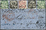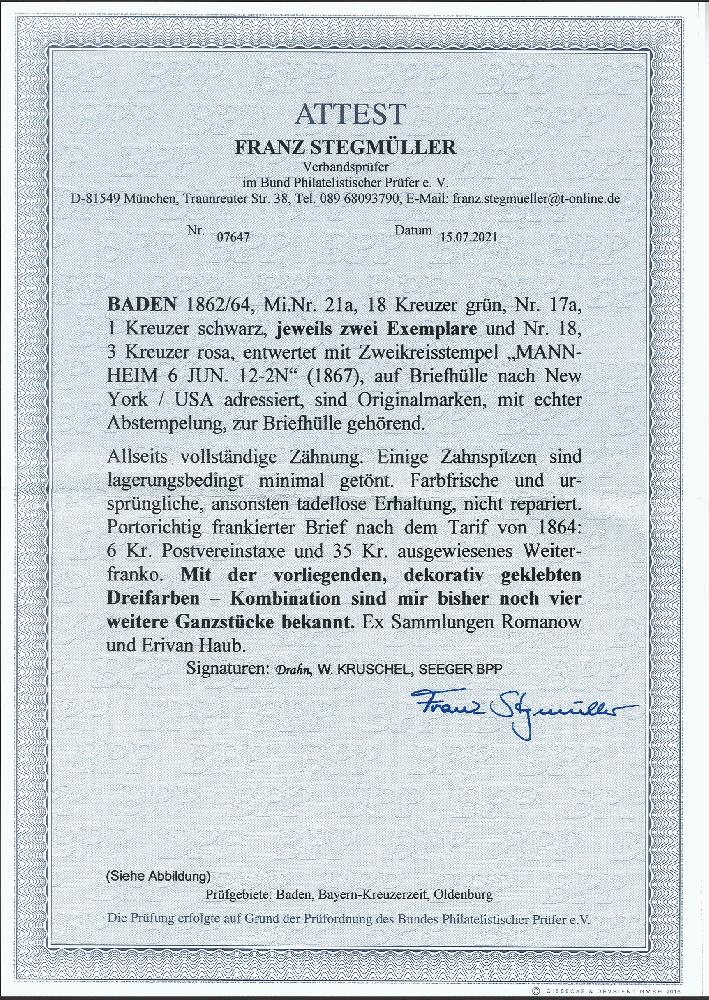| Zusatzinformationen und Suchstichworte: | 377. Auktion Heinrich Köhler 20. - 25. September 2021 Los 16 1862/64, 18 Kreuzer grün, 2 Einzelwerte zusammen mit 2 Einzelwerten 1 Kreuzer schwarz und Einzelmarke 3 Kreuzer rosa, alle einwandfrei gezähnt und farbfrisch (lediglich einige Zahnspitzen lagerungsbedingt minimal getönt), sehr schön abwechselnd geklebt mit einzeln aufgesetztem Doppelkreisstempel "MANNHEIM 6 JUN." (1867) auf Briefhülle mit Leitvermerk "via Ostende & Queenstown" nach New York mit vorderseitigem roten Doppelkreisstempel "AACHEN PAID 23 Cts." und Anlandestempel von New York. Der Brief ist nach dem Tarif von 1864 portogerecht frankiert mit 6 Kreuzern Vereinsporto und 35 Kreuzern ausgewiesenem Weiterfranko. Ein äußerst attraktiver und seltener Brief. Signiert Drahn, Kruschel und Seeger BPP mit Fotoattest sowie Fotoattest Stegmüller BPP (2021) Ausruf 3.000,00 EUR Zuschlag 7.000,00 EUR (aus der Sammlung Erivan Haub) |
