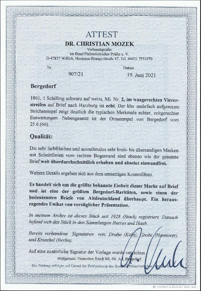 | Zusatzinformationen und Suchstichworte: | 377. Auktion Heinrich Köhler 20. - 25. September 2021 Los 23 1 Schilling schwarz im waagerechten 4er-Streifen vom rechten Bogenrand, sehr schön farbfrisch und ausnahmslos breit- bis überrandig, mit kreuzweise aufgesetzten Strichstempeln und klar nebengesetztem "BERGEDORF 25 7 II T" (1866) auf blauer Briefhülle nach Harzburg im Herzogtum Braunschweig; rückseitig Durchgangsstempel von Hamburg sowie Ankunfts- und Stundenstempel. Größte bekannte Einheit dieser Marke und auf Brief eine der großen Seltenheiten der Bergedorf- und Altdeutschland-Philatelie. Ein phantastisches Stück in taufrischer und tadelloser Erhaltung. Signiert Drahn und Kruschel, Fotoattest Dr. Mozek BPP (2021) Ausruf 40.000,00 EUR Zuschlag 100.000,00 EUR (aus der Sammlung Erivan Haub) |