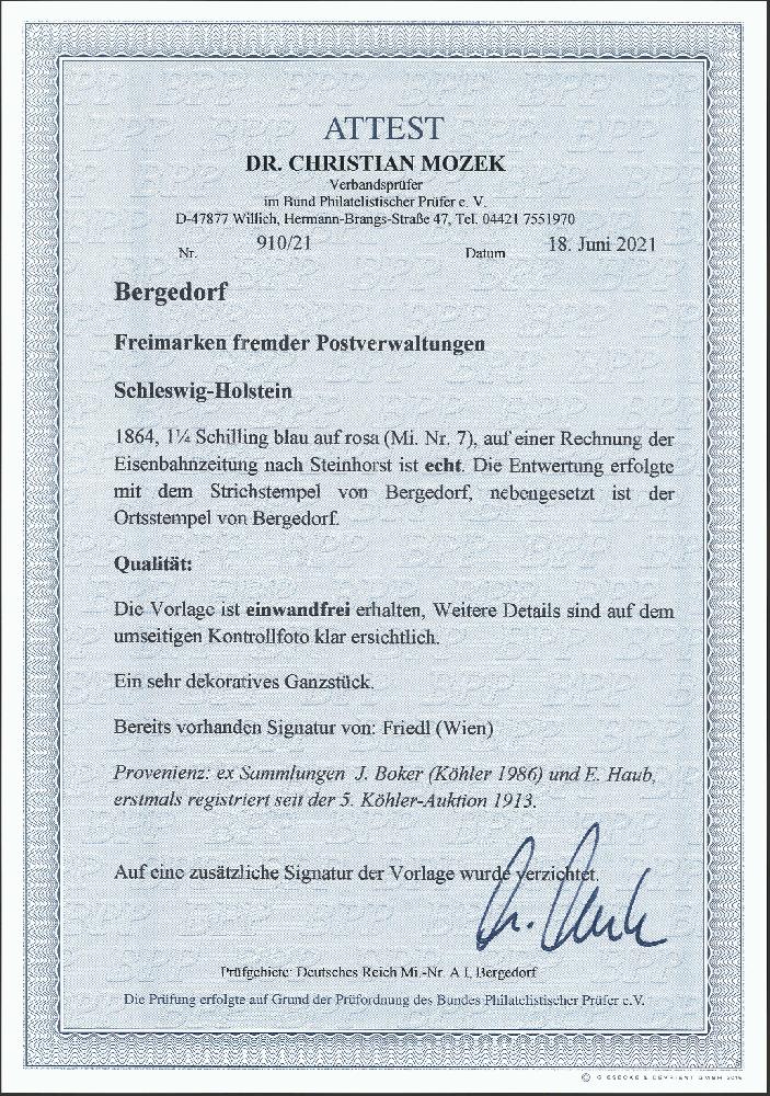 | Zusatzinformationen und Suchstichworte: | 377. Auktion Heinrich Köhler 20. - 25. September 2021 Los 28 1¼ Schilling blau auf rosa, farbfrisch und tadellos durchstochen mit klar aufgesetztem Strichstempel und nebengesetztem "BERGEDORF 21 1" (1865) auf kompletter Rechnung der Eisenbahn-Zeitung nach Steinhorst. Sehr schöne frische und tadellose Erhaltung. Signiert Friedl, Fotoattest Dr. Mozek BPP (2021) Ausruf 500,00 EUR Zuschlag 1.000,00 EUR (aus der Sammlung Erivan Haub) |