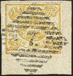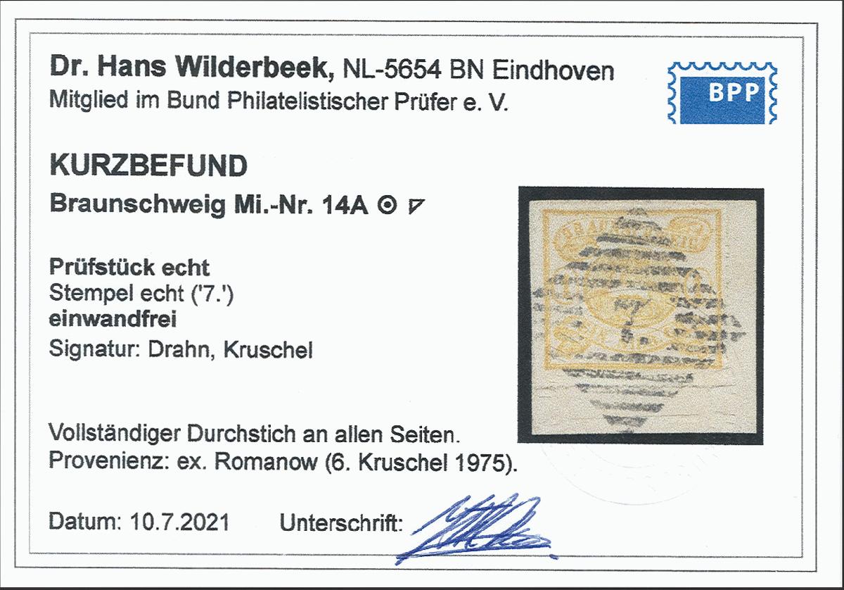 | Zusatzinformationen und Suchstichworte: | 377. Auktion Heinrich Köhler 20. - 25. September 2021 Los 33 1864, 1 Silbergroschen gelbocker, bogenförmig durchstochen 16, farbfrisch und tadellos durchstochen mit gerade und klar aufgesetzter Nummer "7" BRAUNLAGE auf Briefstück, Luxus, signiert Drahn und Kruschel, Kurzbefund Dr. Wilderbeek BPP Ausruf 80,00 EUR Zuschlag 220,00 EUR (aus der Sammlung Erivan Haub) |
