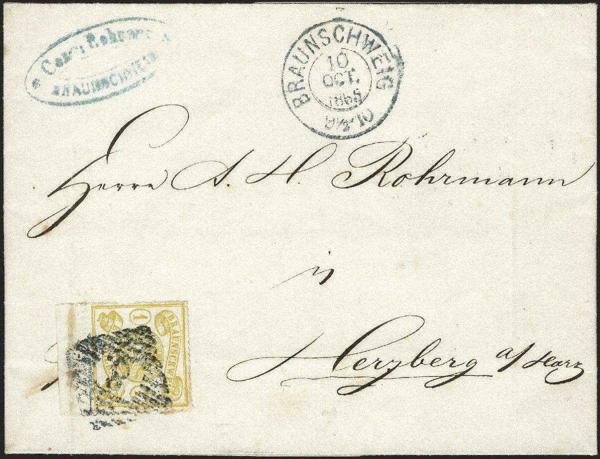 | Zusatzinformationen und Suchstichworte: | 377. Auktion Heinrich Köhler 20. - 25. September 2021 Los 34 1 Silbergroschen gelbocker, Unterrandstück mit ca. 6 mm Bogenrand, farbfrisch und mit meist gutem Durchstich, lediglich links etwas unregelmäßig getrennt, mit Nummer "8" und nebengesetztem Doppelkreisstempel "BRAUNSCHWEIG 10 OCT: 1865" auf komplettem Faltbrief nach Herzberg im Königreich Hannover. Gebrauchte Randstücke der durchstochenen Ausgaben sind selten. Fotoattest Wilderbeek BPP (2021) Ausruf 150,00 EUR Zuschlag 300,00 EUR (aus der Sammlung Erivan Haub) |