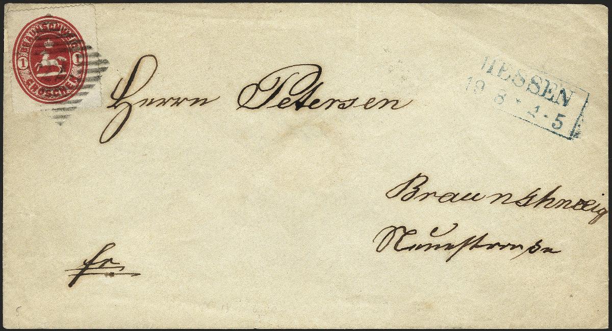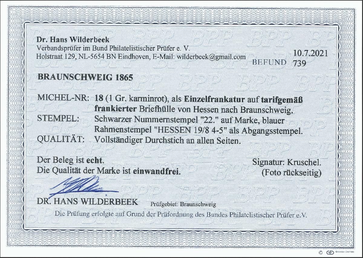 | Zusatzinformationen und Suchstichworte: | 377. Auktion Heinrich Köhler 20. - 25. September 2021 Los 35 "22" in schwarz klar auf 1865, 1 Groschen karminrot, farbfrisch und gut durchstochen auf Briefkuvert mit sauber nebengesetztem blauen Rahmenstempel "HESSEN 19 8" nach Braunschweig, Pracht, signiert Kruschel und Fotobefund Dr. Wilderbeek BPP (2021) Ausruf 150,00 EUR Zuschlag 520,00 EUR (aus der Sammlung Erivan Haub) |
