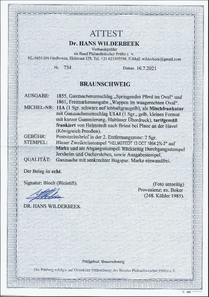 | Zusatzinformationen und Suchstichworte: | 377. Auktion Heinrich Köhler 20. - 25. September 2021 Los 37 1855, Ganzsachenumschlag 1 Silbergroschen gelb mit Zufrankatur 1861/63, 1 Silbergroschen schwarz auf lebhaftgraugelb, farbfrisch und allseits breitrandig mit sauber auf- und nebengesetztem blauschwarzen Doppelkreisstempel "HELMSTEDT 13 OCT. 1864" nach Briest bei Plaue in Preußen; senkrechte Bugspur außerhalb der Frankatur, sonst einwandfreie und schöne Erhaltung. Signiert Bloch und Fotoattest Dr. Wilderbeek BPP (2021) Ausruf 150,00 EUR Zuschlag 1.000,00 EUR (aus der Sammlung Erivan Haub) |