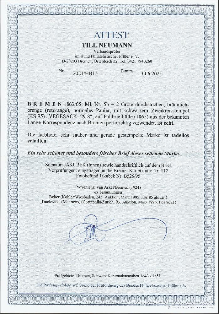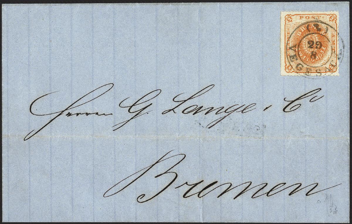 | Zusatzinformationen und Suchstichworte: | 377. Auktion Heinrich Köhler 20. - 25. September 2021 Los 40 1863/65, 2 Grote bräunlichorange, normales Papier, sehr schön farbfrisch und tadellos durchstochen mit sauber aufgesetztem kleinen Doppelkreisstempel "VEGESACK 29 8" (1865) auf Briefhülle nach Bremen. Besonders schöne und tadellose Erhaltung. Es sind nur 8 Einzelfrankaturen dieser Marke registriert, mit dem Stempel von Vegesack von ganz besonderem Reiz. Signiert Jakubek und Fotoattes Neumann BPP (2021) Ausruf 8.000,00 EUR Zuschlag 17.000,00 EUR (aus der Sammlung Erivan Haub) |