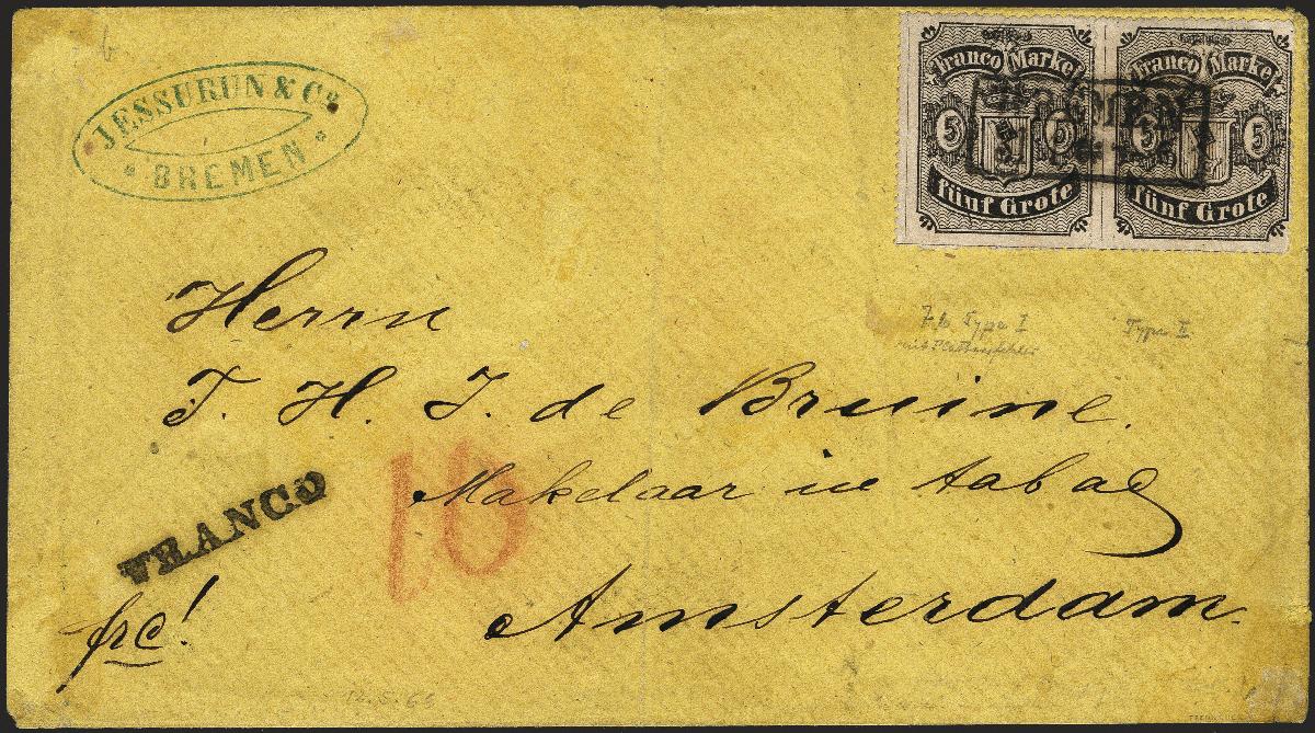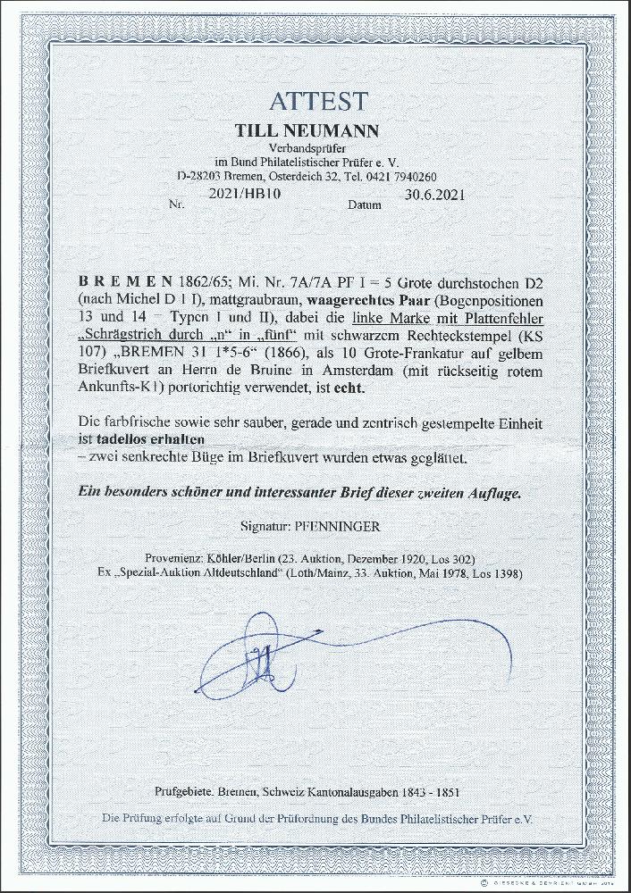 | Zusatzinformationen und Suchstichworte: | 377. Auktion Heinrich Köhler 20. - 25. September 2021 Los 42 1862/65, 5 Grote schwarz auf mattgraubraun im waagerechten Paar der Bogenpositionen 13 und 14 mit den Typen I und II, dabei die linke Marke mit Plattenfehler "Schrägstrich durch n in fünf", farbfrisch und gut durchstochen, mit sauber aufgesetztem Rahmenstempel "BREMEN 31 1" (1866) auf orangefarbenem Briefkuvert nach Amsterdam mit nebengesetztem "FRANCO" und rückseitigem Ankunftsstempel. Senkrechte Büge außerhalb der Frankatur etwas geglättet, sonst tadellose Erhaltung. Ein attraktiver und seltener Auslandsbrief. Signiert Pfenninger und Fotoattest Neumann BPP (2021) Ausruf 3.000,00 EUR Zuschlag 4.600,00 EUR (aus der Sammlung Erivan Haub) |
