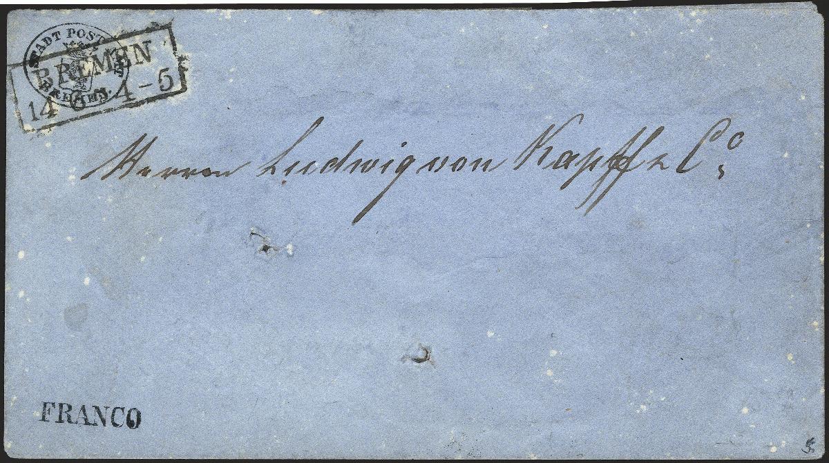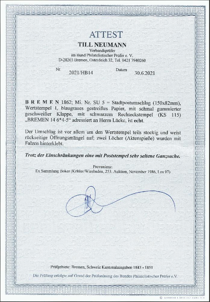 | Zusatzinformationen und Suchstichworte: | 377. Auktion Heinrich Köhler 20. - 25. September 2021 Los 45 1862, Stadtpostumschlag auf blaugrauem, gestreiftem Papier mit schmal gummierter geschweifter Klappe, sauber entwertet durch Rahmenstempel "BREMEN 14 6" als Ortsbrief gelaufen. Einige Altersfleckchen und 2 Aufspießlöcher mit Falzen hinterklebt. Fotoattest Neumann BPP (2021) Ausruf 100,00 EUR Zuschlag 1.250,00 EUR (aus der Sammlung Erivan Haub) |