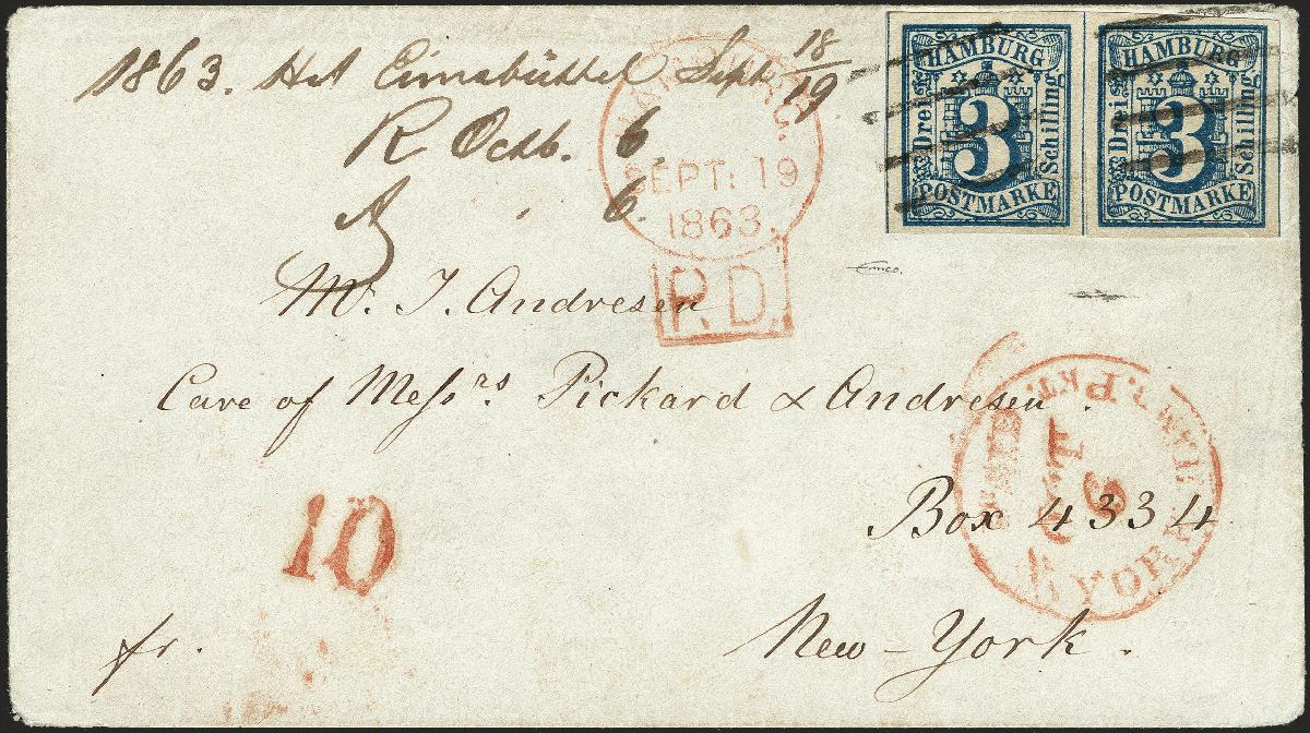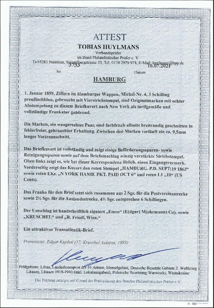 | Zusatzinformationen und Suchstichworte: | 377. Auktion Heinrich Köhler 20. - 25. September 2021 Los 46 3 Schilling preußischblau im waagerechten Paar, farbfrisch und allseits breitrandig geschnitten, mit sauberen Strichstempeln auf Briefkuvert mit nebengesetztem "HAMBURG P.D. SEPT: 19 1863" nach New York mit rotem "N YORK HAMB. PKT PAID OCT 6", der Stempel auf dem Umschlag winzig und unbedeutend verstärkt, sonst tadellos. Ein sehr attraktiver und seltener Brief, wir haben nur wenige weitere derartige Briefe registriert, signiert Emco, Kruschel sowie R. Friedl und Fotoattest Huylmans BPP (2021) Ausruf 1.000,00 EUR Zuschlag 3.200,00 EUR (aus der Sammlung Erivan Haub) |