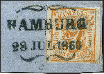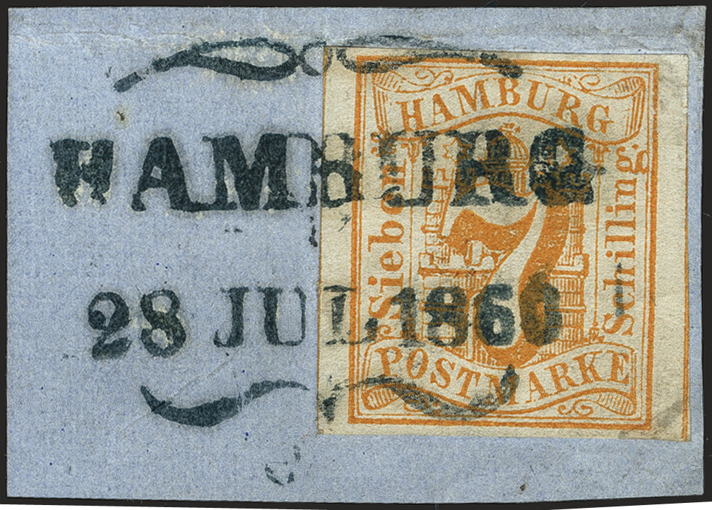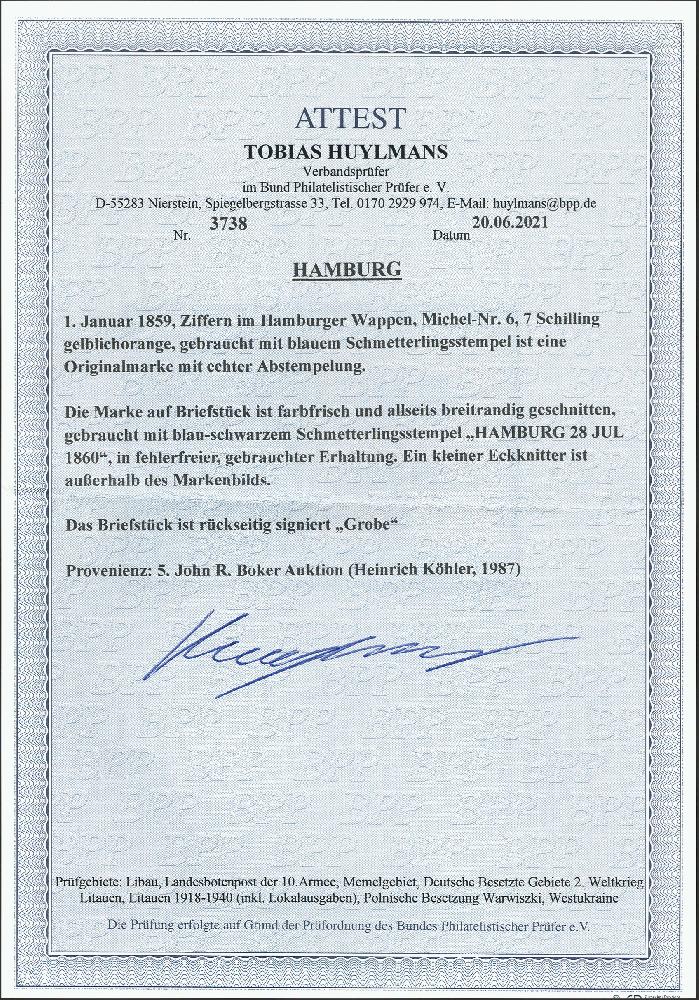 | Zusatzinformationen und Suchstichworte: | 377. Auktion Heinrich Köhler 20. - 25. September 2021 Los 47 7 Schilling orange, farbfrisch und allseits breitrandig geschnitten, rechts mit Teil der Trennungslinie, sauber mit schwarz-blauem Schmetterlingsstempel "HAMBURG 28 JUL 1860" auf kleinem Briefstück, ein kleiner Eckknitter außerhalb des Markenbilds, sonst tadellos. Ein sehr schönes und dekoratives Briefstück, sign. Grobe sowie Fotoattest Huylmans BPP (2021) Ausruf 100,00 EUR Zuschlag 320,00 EUR (aus der Sammlung Erivan Haub) |