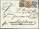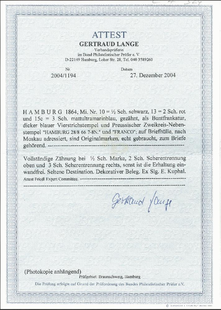 | Zusatzinformationen und Suchstichworte: | 377. Auktion Heinrich Köhler 20. - 25. September 2021 Los 49 1864, ½ Schilling schwarz, 2 Schilling rot und 3 Schilling mattultramarin, alle farbfrisch und bis auf einseitige Scherentrennung bei 2 und 3 Schilling gut gezähnt mit blauem Strichstempel auf Briefhülle mit nebengesetztem preußischem DKr. "HAMBURG 28 8 66" nach Moskau. Eine seltene und äußerst attraktive Farbfrankatur mit seltener Destination, Fotoattest Friedl Expert Committee (1975) und Lange BPP (2004) Ausruf 1.000,00 EUR Zuschlag 3.400,00 EUR (aus der Sammlung Erivan Haub) |