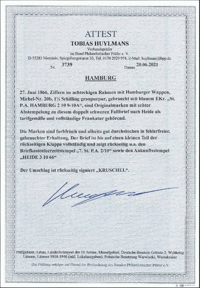 | Zusatzinformationen und Suchstichworte: | 377. Auktion Heinrich Köhler 20. - 25. September 2021 Los 53 1866, Prägedruckausgabe 1¼ Schilling graupurpur, zwei Einzelmarken, farbfrisch und gut durchstochen mit klarem EKr. "St. P.A. HAMBURG 2 10" auf Faltbrief der 2. Gewichtstufenach Heiden. Kleiner Teil der rückseitigen Klappe fehlend, sonst einwandfrei. Ein sehr attraktiver Brief. Signiert Kruschel, Fotoattest Huylmans BPP (2021) Ausruf 150,00 EUR Zuschlag 400,00 EUR (aus der Sammlung Erivan Haub) |