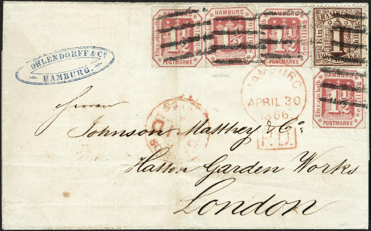 | Zusatzinformationen und Suchstichworte: | 377. Auktion Heinrich Köhler 20. - 25. September 2021 Los 54 1866, Prägedruckausgabe 1½ Schilling. rosakarmin, vier Werte zusammen mit 1 Schilling braun mit dickem Strichstempel auf Briefhülle mit nebengesetztem "HAMBURG P.D. APRIL 30 1866." nach London, senkrechte Büge durch drei 1½ Schilling , kleiner Zahnspalt bei der 1 Schilling-Marke, sonst in tadelloser Erhaltung. Mischfrankaturen mit Prägedruckmarken sind sehr selten, in dieser Form als 7 Schilling Frankatur nach Großbritannien ist kein weiteres Stück registriert. Signiert Kruschel sowie Emco und Fotoatteste Hunziker (1961) und Huylmans BPP (2021) Ausruf 1.000,00 EUR Zuschlag 2.600,00 EUR (aus der Sammlung Erivan Haub) |