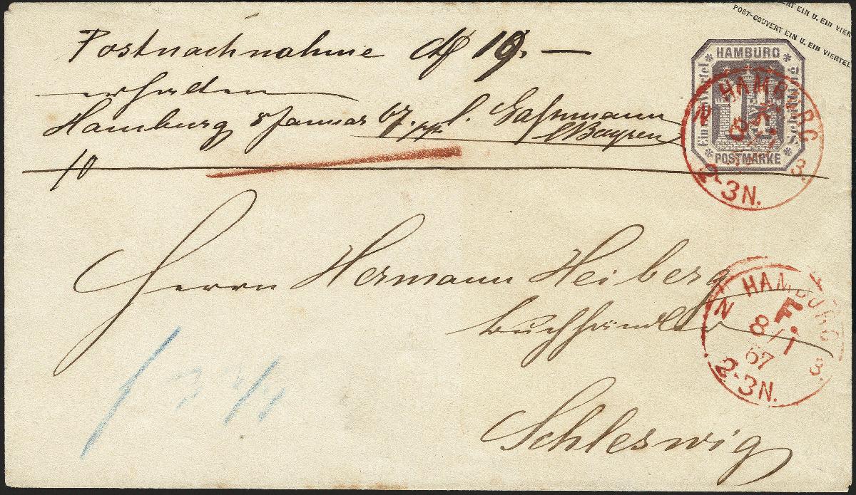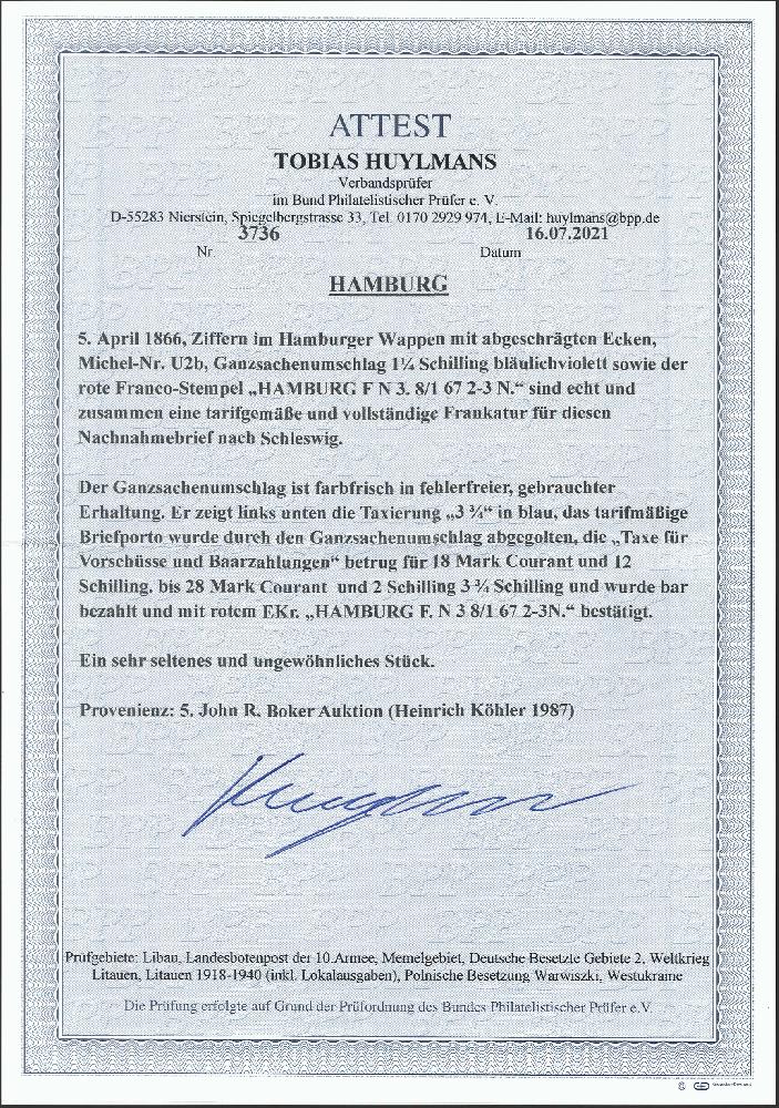 | Zusatzinformationen und Suchstichworte: | 377. Auktion Heinrich Köhler 20. - 25. September 2021 Los 57 1866, Ganzsachenumschlag 1¼ Schilling bläulichviolett mit rotem, preußischen "HAMBURG F. N 3 8/1 67 2-3N" auf dem Wertstempel und nebengesetzt, als Postnachnahme-Brief über 19 Mark Courant nach Schleswig, links unten austaxiert „3 ¾“. Das tarifmäßige Briefporto wurde durch den Ganzsachenumschlag abgegolten, die „Taxe für Vorschüsse und Baarzahlungen“ wurde bar bezahlt und mit dem Franko bestätigt. Ein sehr seltenes und ungewöhnliches Stück. Fotoattest Huylmans BPP (2021) Ausruf 1.000,00 EUR Zuschlag 6.000,00 EUR (aus der Sammlung Erivan Haub) |