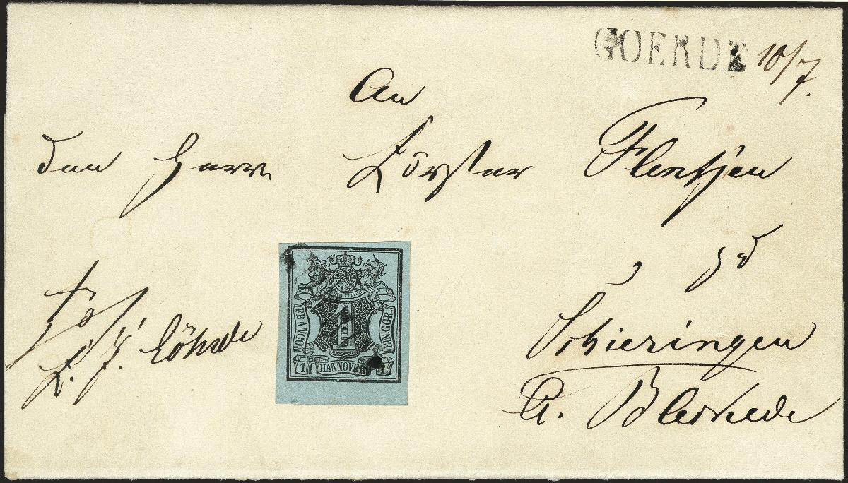 | Zusatzinformationen und Suchstichworte: | 377. Auktion Heinrich Köhler 20. - 25. September 2021 Los 62 1 Gutegroschen schwarz auf blaugrau, voll- bis breitrandiges Unterrandstück mit sauber auf- und nebengesetztem Langstempel "GOERDE" auf komplettem Faltbrief (eine Seitenklappe etwas verkürzt) nach Schieringen mit handschriftlich zugesetztem Datum "10/7." (1851). Ein sehr attraktiver Brief. Signiert Metzer und Fotoattest Jäschke-L. BPP (2021) Ausruf 150,00 EUR Zuschlag 850,00 EUR (aus der Sammlung Erivan Haub) |