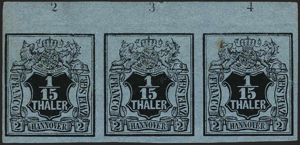 | Zusatzinformationen und Suchstichworte: | 377. Auktion Heinrich Köhler 20. - 25. September 2021 Los 67 1851, Postvereinsausgabe 1/15Thaler schwarz auf graublau, waagerechter 3er-Streifen vom oberen Bogenrand, farbfrisch und allseits breitrandig, oben mit ca. 6 mm Bogenrand mit Reihenzählern "2" bis "4", ungebraucht mit Originalgummi. Bei der mittleren Marke im oberen Bogenrand kleiner Randspalt, die beiden anderen Werte minimale Stockfleckchen (nur eins vorderseitig sichtbar). Eine sehr seltene und attraktive Einheit. Fotoattest Jäschke-L. BPP (2021) Ausruf 1.000,00 EUR Zuschlag 5.200,00 EUR (aus der Sammlung Erivan Haub) |