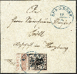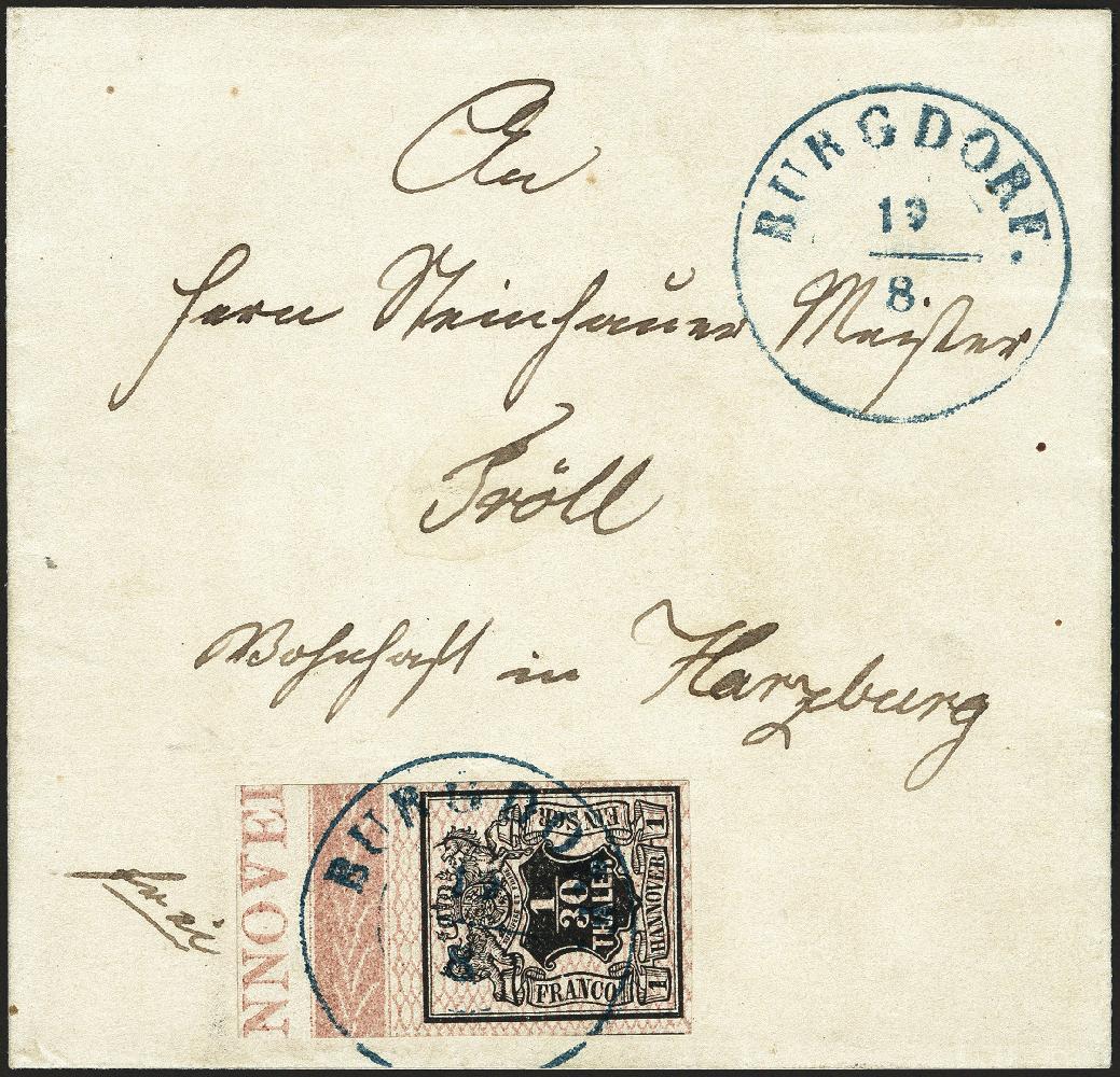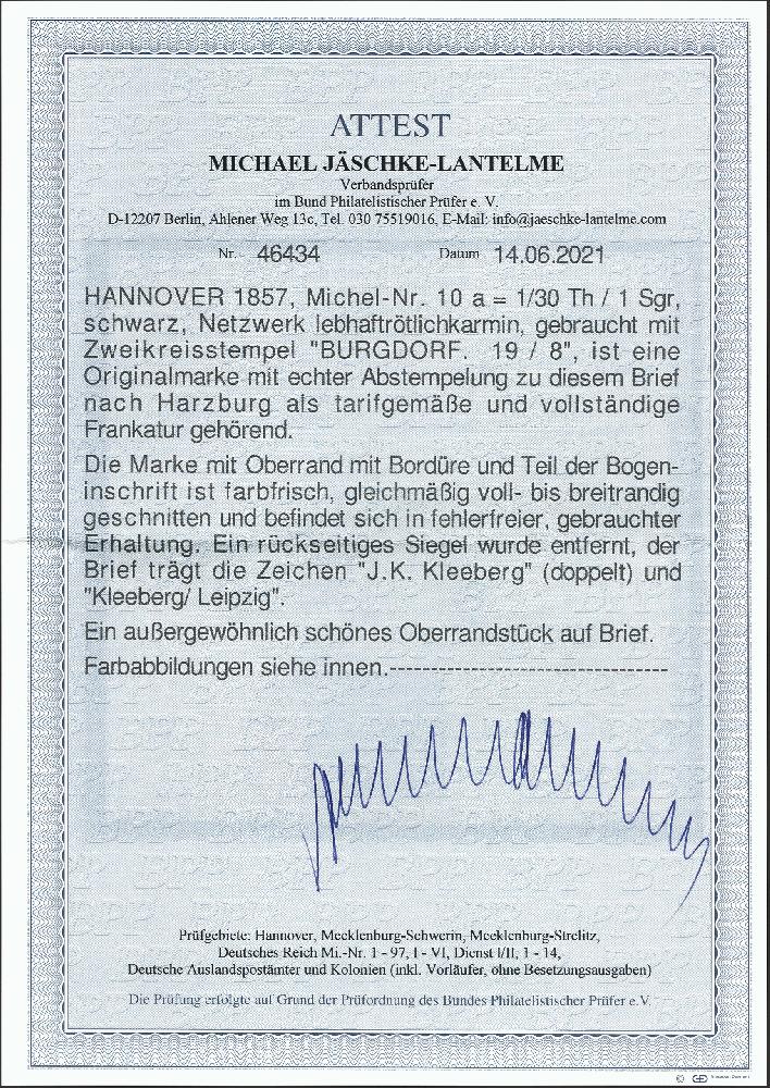 | Zusatzinformationen und Suchstichworte: | 377. Auktion Heinrich Köhler 20. - 25. September 2021 Los 73 1856/57, Netzuntergrund 1/30 Thaler schwarz, rosa genetzt, Oberrandstück, farbfrisch und voll- bis überrandig, oben mit breitem Bogenrand mit Bordüre und Teil der Randinschrift "NNOVER", mit sauber auf- und nebengesetztem Doppelkreisstempel "BURGDORF 19/8" auf kleiner Briefhülle nach Harzburg mit Ankunftsstempel. Ein außerordentlich attraktiver Brief in sehr schöner Erhaltung. Signiert Kleeberg und Fotoattest Jäschke-L. BPP (2021) Ausruf 400,00 EUR Zuschlag 2.200,00 EUR (aus der Sammlung Erivan Haub) |