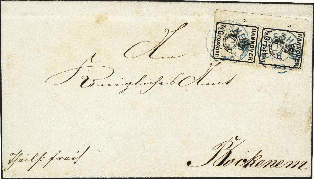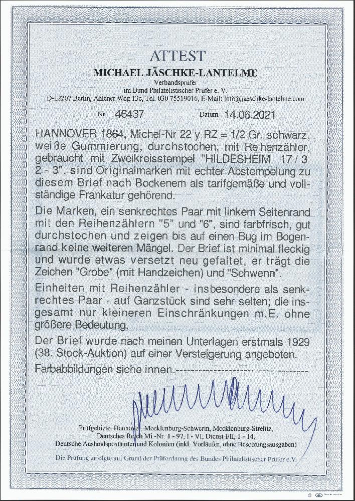 | Zusatzinformationen und Suchstichworte: | 377. Auktion Heinrich Köhler 20. - 25. September 2021 Los 79 ½ Groschen schwarz im senkrechten Paar, farbfrisch und gut durchstochen mit linkem Bogenrand, hierauf Reihenzähler "5" und "6", mit blauem Doppelkreisstempel "HILDESHEIM 17/3" auf Briefhülle nach Bockenem mit Ankunftsstempel. Leicht fleckig und im unteren Bogenrand leichte Bugspur. Signiert Grobe und Schwenn, Fotoattest Jäschke-L. BPP (2021) Ausruf 800,00 EUR Zuschlag 1.400,00 EUR (aus der Sammlung Erivan Haub) |