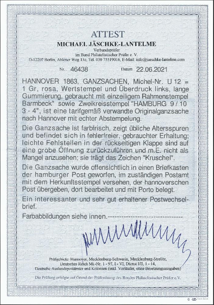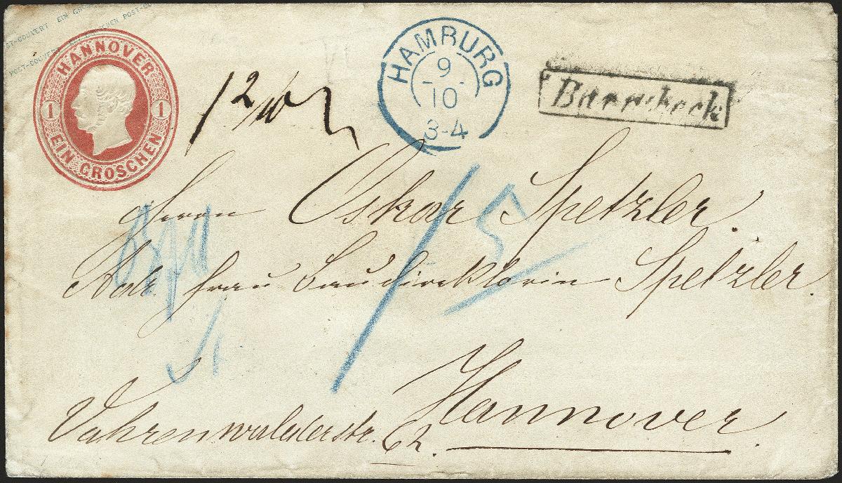 | Zusatzinformationen und Suchstichworte: | 377. Auktion Heinrich Köhler 20. - 25. September 2021 Los 80 1863, Ganzsachenumschlag 1 Groschen rosa mit nebengesetztem Landpoststempel "Barmbeck" sowie blauem Doppelkreisstempel "HAMBURG 9/10" nach Hannover mit rückseitigem Durchgangsstempel des Hamburger Stadtpostamtes sowie Ankunftsstempel. Da der Brief in die 2. Gewichtsstufe fiel nachtaxiert mit vorderseitiger Blaustifttaxe. Kleiner Teil der rückseitigen Verschlußklappe fehlend, sonst gute Erhaltung. Ein interessanter und seltener Brief. Ausruf 1.000,00 EUR Zuschlag 1.800,00 EUR (aus der Sammlung Erivan Haub) |