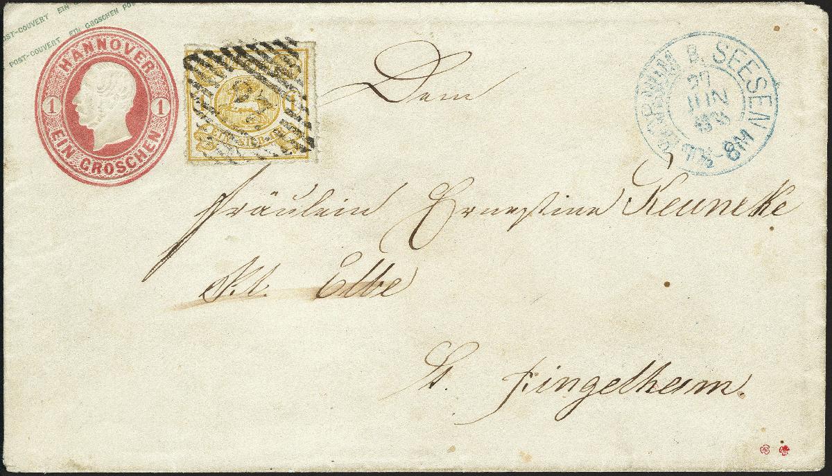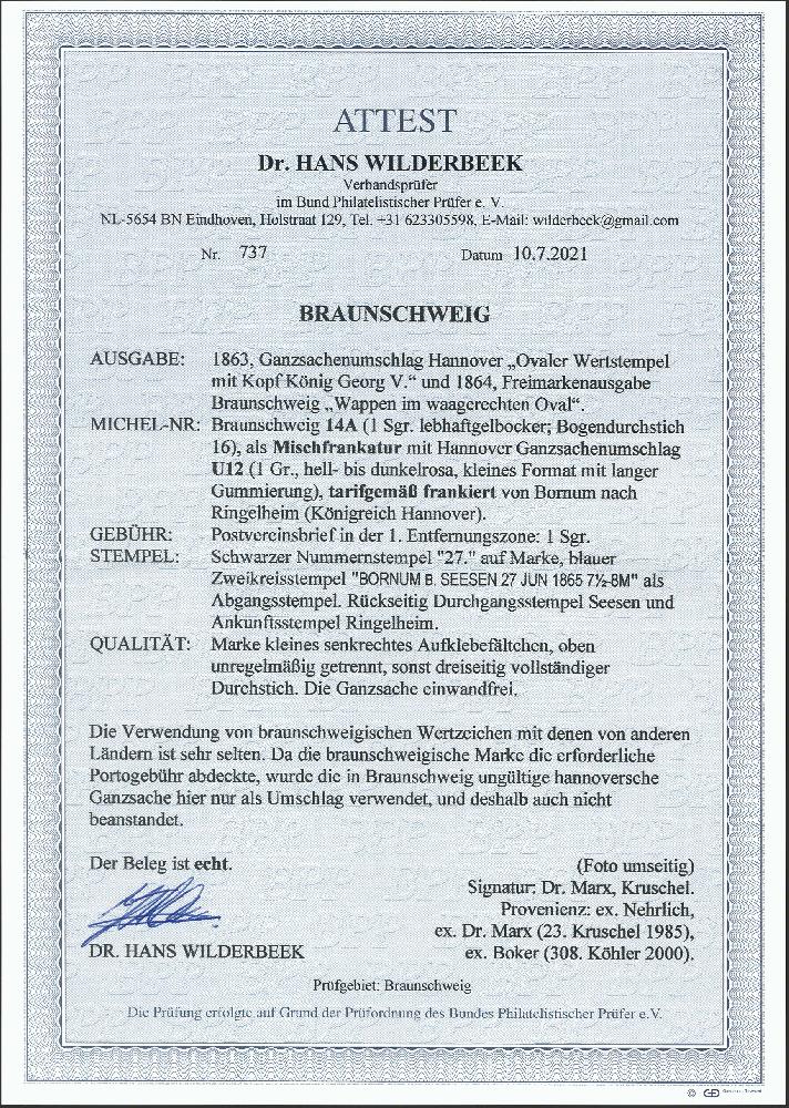 | Zusatzinformationen und Suchstichworte: | 377. Auktion Heinrich Köhler 20. - 25. September 2021 Los 81 Umschlag 1 Silbergroschen rosa als Formblatt verwendet mit Braunschweig 1864, 1 Silbergroschen lebhaftgelbocker, durchstochen 16, mit Nummer "27" und nebengesetztem blauen Doppelkreisstempel "BORNUM B. SEESEN 27 UN 1865" nach Ringelheim mit Durchgangsstempel von Seesen und Ankunftsstempel. Die Marke oben etwas unregelmäßig getrennt und kleines Aufklebefältchen, sonst einwandfrei. Ein interessanter und in dieser Form seltener Brief. Signiert Dr. Marx und Kruschel Ausruf 300,00 EUR Zuschlag 850,00 EUR (aus der Sammlung Erivan Haub) |