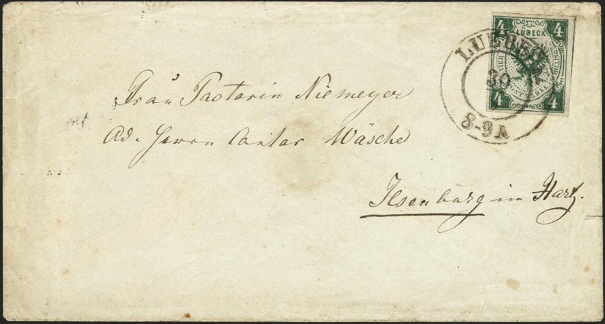 | Zusatzinformationen und Suchstichworte: | 377. Auktion Heinrich Köhler 20. - 25. September 2021 Los 83 4 Schilling dunkelgrün, farbfrisch und allseits breit- bis überrandig, rechts mit Teil der Nachbarmarke, mit sauber aufgesetztem Doppelkreisstempel "LUEBECK 30/8" auf Briefkuvert nach EIsenburg im Harz mit rückseitigem Ausgabestempel. Der Oberrand der Marke minimal getönt, sonst schöne und einwandfreie ursprüngliche Erhaltung. Ein schöner Brief mit seltener Ortsstempel-Entwertung. Fotoattest Mehlmann BPP (2021) Ausruf 1.000,00 EUR Zuschlag 1.700,00 EUR (aus der Sammlung Erivan Haub) |