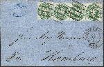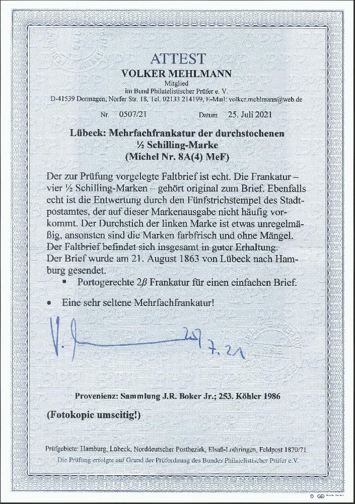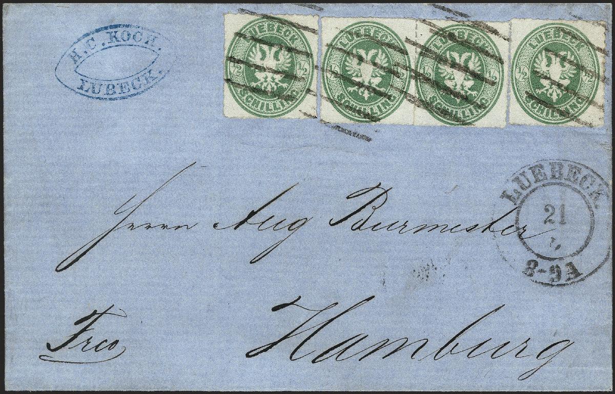 | Zusatzinformationen und Suchstichworte: | 377. Auktion Heinrich Köhler 20. - 25. September 2021 Los 85 1863/67, ½ Schilling dunkelgelblichgrün, 4 Einzelwerte als Streifen geklebt, alle farbfrisch und bis auf leicht unregelmäßigem Durchstich bei der linken Marke tadellos, mit sauber aufgesetzten Strichstempeln und sauber nebengesetztem Doppelkreisstempel "LUEBECK 21/8" (1863) auf Briefhülle nach Hamburg. Eine seltene und attraktive Mehrfachfrankatur, die die Heinrich Köhler-Kartei nur ein weiteres Mal registriert hat und die nur von Juli 1863 bis Ende 1864 auf Briefen nach Hamburg, Bergedorf und Schwerin möglich war. Fotoattest Mehlmann BPP Ausruf 3.000,00 EUR Zuschlag 4.800,00 EUR (aus der Sammlung Erivan Haub) |