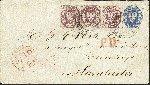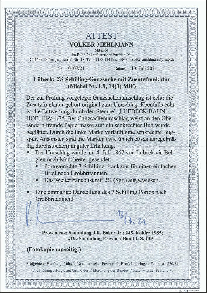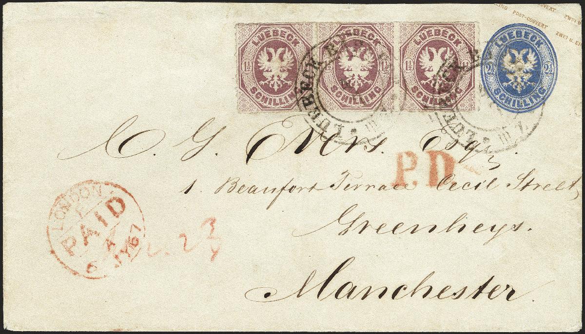 | Zusatzinformationen und Suchstichworte: | 377. Auktion Heinrich Köhler 20. - 25. September 2021 Los 87 Umschlag 2½ Schilling ultramarin mit Zufrankatur 1865, Ergänzungswert 1½ Schilling dunkelbraunpurpur im waagerechten 3er-Streifen mit Doppelkreisstempel "LUEBECK BAHNHOF III Z. 4/7" nach Manchester mit Ankunftsstempel. Ein durch die linke Marke des Streifens verlaufende senkrechte Bugspur unauffällig geglättet und der Umschlag oben etwas ausgebessert, sonst gute und attraktive Erhaltung. Eine einmalige Frankaturkombination zur Darstellung des 7 Schilling-Portos nach Großbritannien. Signiert Drahn und Kruschel, Fotoattest Mehlmann BPP (2021) Ausruf 1.500,00 EUR Zuschlag 2.000,00 EUR (aus der Sammlung Erivan Haub) |