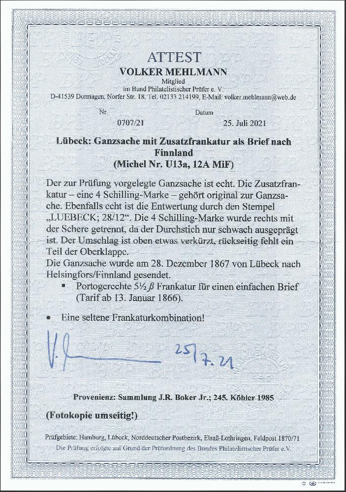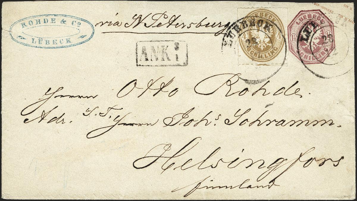 | Zusatzinformationen und Suchstichworte: | 377. Auktion Heinrich Köhler 20. - 25. September 2021 Los 89 Umschlag 1½ Schilling rosa mit Zufrankatur 1863, 4 Schilling mittelolivbraun, rechts Scherentrennung außerhalb eines nur schwach gekommenen Durchstiches, sonst einwandfrei, mit sauber aufgesetztem Doppelkreisstempel "LUEBECK 28/12" (1867) nach Helsingfors in Finnland mit vorderseitigem "ANK3 1". Das Kuvert durch Öffnung minimal verkürzt, ein Teil der rückseitigen Verschlußklappe fehlend. Ein attraktiver Auslandsbrief; die Heinrich Köhler-Kartei hat keine weitere derartige Kombination registriert. Fotoattest Mehlmann BPP (2021) Ausruf 2.000,00 EUR (aus der Sammlung Erivan Haub) |