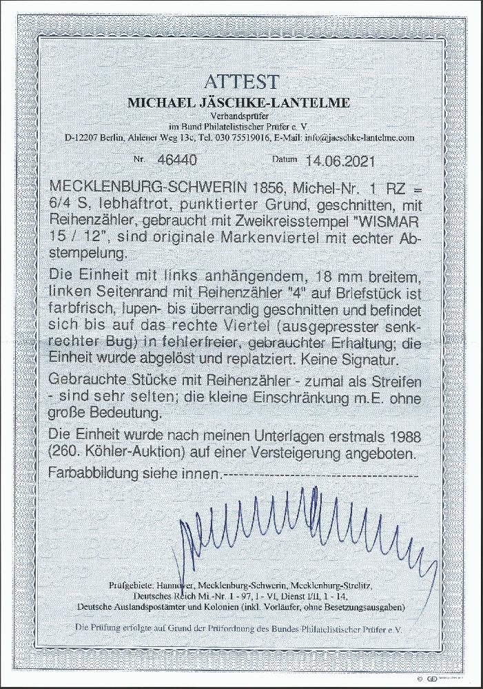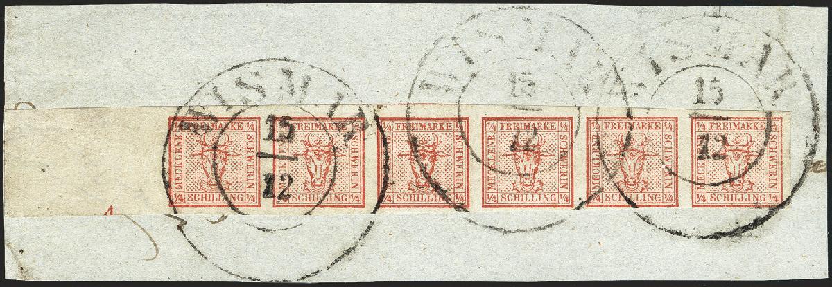 | Zusatzinformationen und Suchstichworte: | 377. Auktion Heinrich Köhler 20. - 25. September 2021 Los 91 6/4 Schilling lebhaftrot im waagerechten Streifen vom linken Bogenrand, voll- bis breitrandig, links ca. 18 mm Bogenrand mit Teil des Reihenzählers "4", mit sauberem Doppelkreisstempel "WISMAR 15/12" auf Briefstück. Bei dem rechten Viertel wurde ein senkrechter Bug unauffällig geglättet, sonst tadellos. Ein attraktiver und seltener Streifen. Fotoattes Jäschke-L. BPP (2021) Ausruf 300,00 EUR Zuschlag 1.000,00 EUR (aus der Sammlung Erivan Haub) |