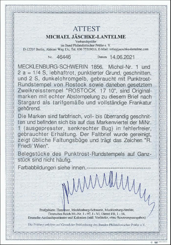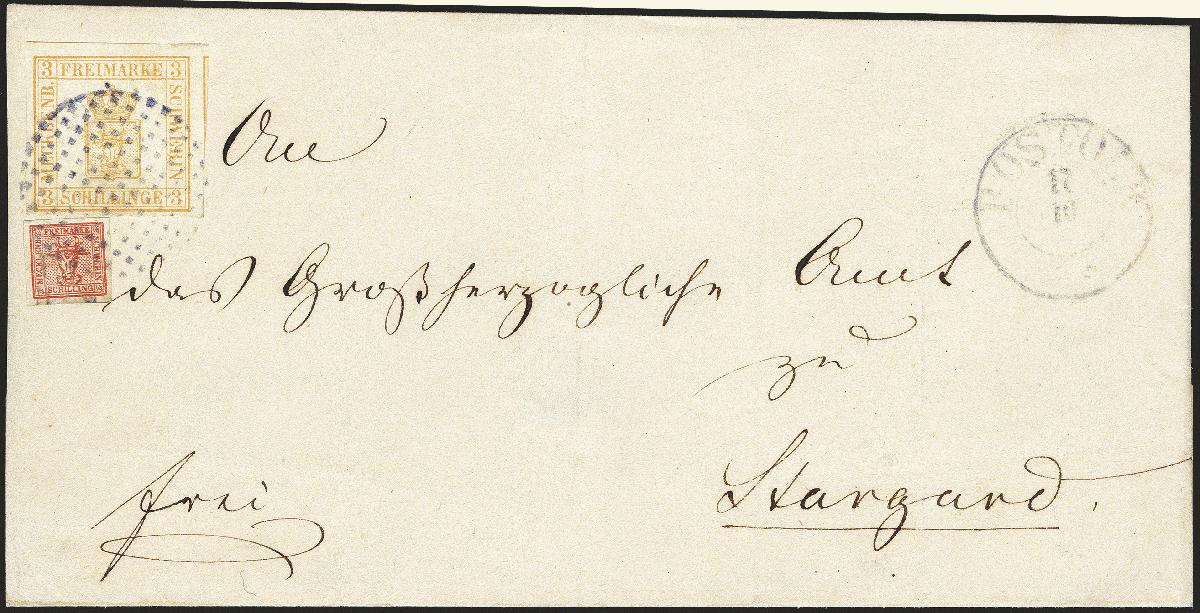| Zusatzinformationen und Suchstichworte: | 377. Auktion Heinrich Köhler 20. - 25. September 2021 Los 93 2 Schilling dunkelchromgelb in Mischfrankatur mit ¼ Schilling lebhaftrot, beide farbfrisch und voll- bis breitrandig, die 3 Schilling rechts mit Teil der Nachbarmarke, mit sauber aufgesetztem Punktrost-Rundstempel auf Briefhülle (eine Seitenklappe fehlend) mit nebengesetztem Doppelkreisstempel "ROSTOCK 17 10" nach Stargard. Die ¼ Schilling mit senkrechtem Bug aufgeklebt, sonst bis auf leichte Reinigungsspuren in der Hülle einwandfrei. Eine attraktive Kombination. Fotoattest Jäschke-L. BPP (2021) Ausruf 500,00 EUR Zuschlag 2.300,00 EUR (aus der Sammlung Erivan Haub) |