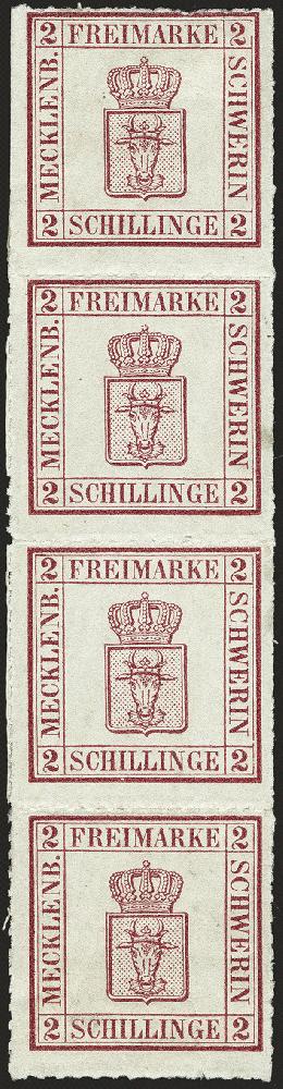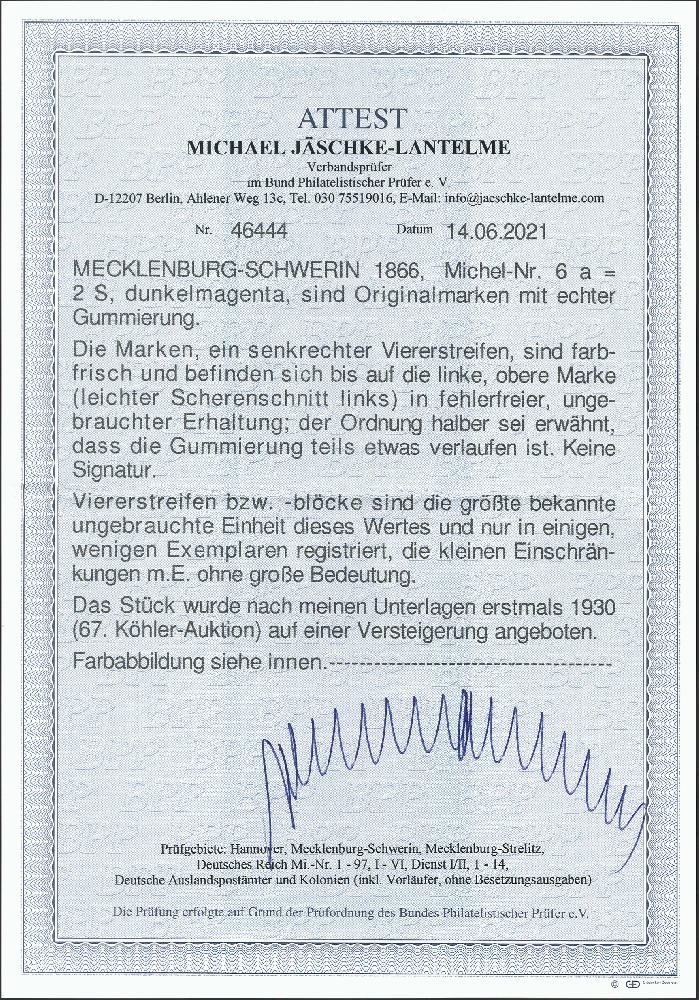 | Zusatzinformationen und Suchstichworte: | 377. Auktion Heinrich Köhler 20. - 25. September 2021 Los 99 2 Schilling dunkelmagenta im senkrechten 4er-Streifen, farbfrisch und bis auf leichtem Scherenschnitt links bei der oberen Marke einwandfrei durchstochen, ungebraucht mit teils etwas verlaufenem Originalgummi, sonst einwandfrei und sehr frisch. Größte bekannte Einheit dieser Marke. Fotoattest Jäschke-L. BPP (2021) Ausruf 1.500,00 EUR Zuschlag 3.200,00 EUR (aus der Sammlung Erivan Haub) |