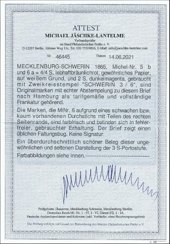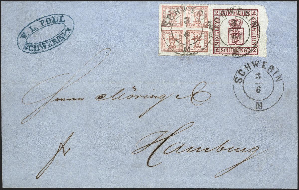 | Zusatzinformationen und Suchstichworte: | 377. Auktion Heinrich Köhler 20. - 25. September 2021 Los 100 2 Schilling dunkelmagenta und 4/4 Schilling lebhaftbräunlichrot, beide farbfrisch und tadellos, die 2 Schilling aufgrund eines schwachen bzw. kaum vorhandenen Durchstiches rechts mit Teilen des Bogenrandes, mit klar auf- und nebengesetztem Doppelkreisstempel "SCHWERIN 3/6" (1867) auf Briefhülle nach Hamburg. Ein außerordentlich attraktiver Brief mit seltener Frankaturkombination, die die Heinrich Köhler-Kartei nur drei weitere Male registriert hat. Fotoattest Jäschke-L. BPP (2021) Ausruf 3.000,00 EUR Zuschlag 3.200,00 EUR (aus der Sammlung Erivan Haub) |