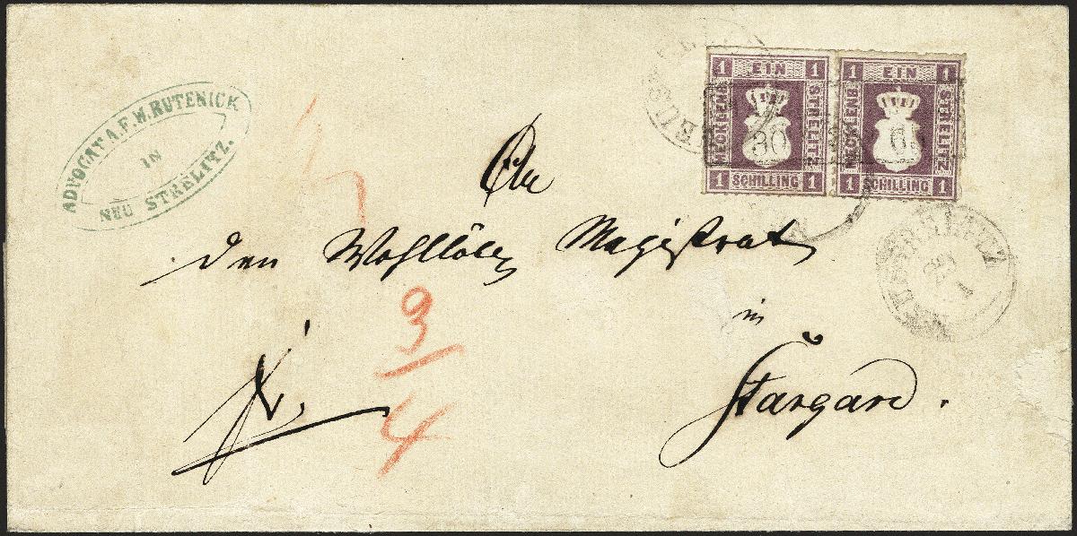 | Zusatzinformationen und Suchstichworte: | 377. Auktion Heinrich Köhler 20. - 25. September 2021 Los 103 1864, 1 Schilling grauviolett im waagerechten Paar, farbfrisch und gut durchstochen mit Einkreisstempel "NEUSTRELITZ 29 3" auf Briefhülle der 2. Gewichtsstufe nach Stargard, hier wurde das Paar aufgrund der unzureichenden Abstempelung der rechten Marke zusätzlich mit dem Rahmenstempel von Stargard entwertet, dieser auch rückseitig als Ankunftsstempel abgeschlagen. Der Brief war für die 2. Gewichtsstufe unterfrankiert, entsprechend mit "3/4" Silbergroschen nachtaxiert. Im Kuvert rechts minimale belanglose Aufrauhung, sonst in tadelloser und frischer Erhaltung. Das frankierte Paar ist die einzige registrierte gebrauchte Einheit dieser Marke, und dieser einmalige Brief somit eine der größten Seltenheiten der Altdeutschland-Philatelie. Signiert Gaston Nehrlich und Kurt Maier, Berlin; Fotoattest Jäschke-L. BPP (2021) Ausruf 30.000,00 EUR Zuschlag 75.000,00 EUR (aus der Sammlung Erivan Haub) |