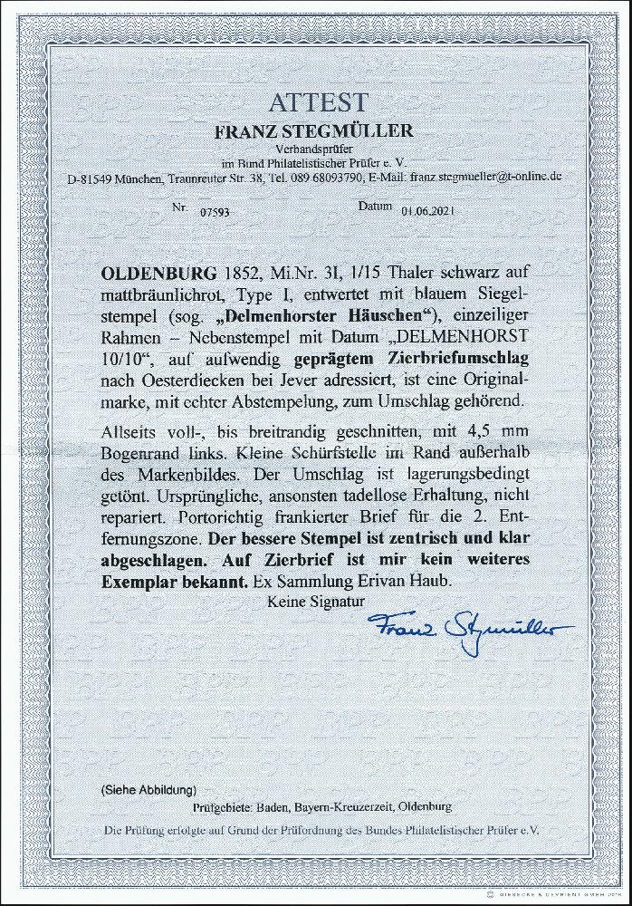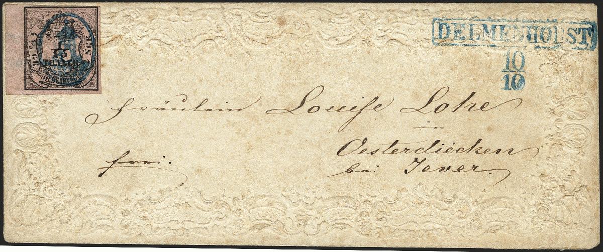 | Zusatzinformationen und Suchstichworte: | 377. Auktion Heinrich Köhler 20. - 25. September 2021 Los 105 1/15 Thaler schwarz auf rosa, Type I, farbfrisch und voll- bis breitrandig, links mit ca. 4mm Bogenrand, mit sauber aufgesetztem 'Delmenhorster Häuschen' und nebengesetztem 'Hammerstempel' "DELMENHORST 10/10" auf kleinem Damenbrief mit breiter, farblos geprägter floraler Zierborde nach Oesterdiecken bei Jever. Die Marke mit kleiner Schürfung im Rand, außerhalb des Markenbildes, der Umschlag leicht getönt, sonst einwandfrei. Ein ganz außergewöhnliches Stück. Fotoattest Stegmüller BPP (2021) Ausruf 2.000,00 EUR Zuschlag 3.900,00 EUR (aus der Sammlung Erivan Haub) |
