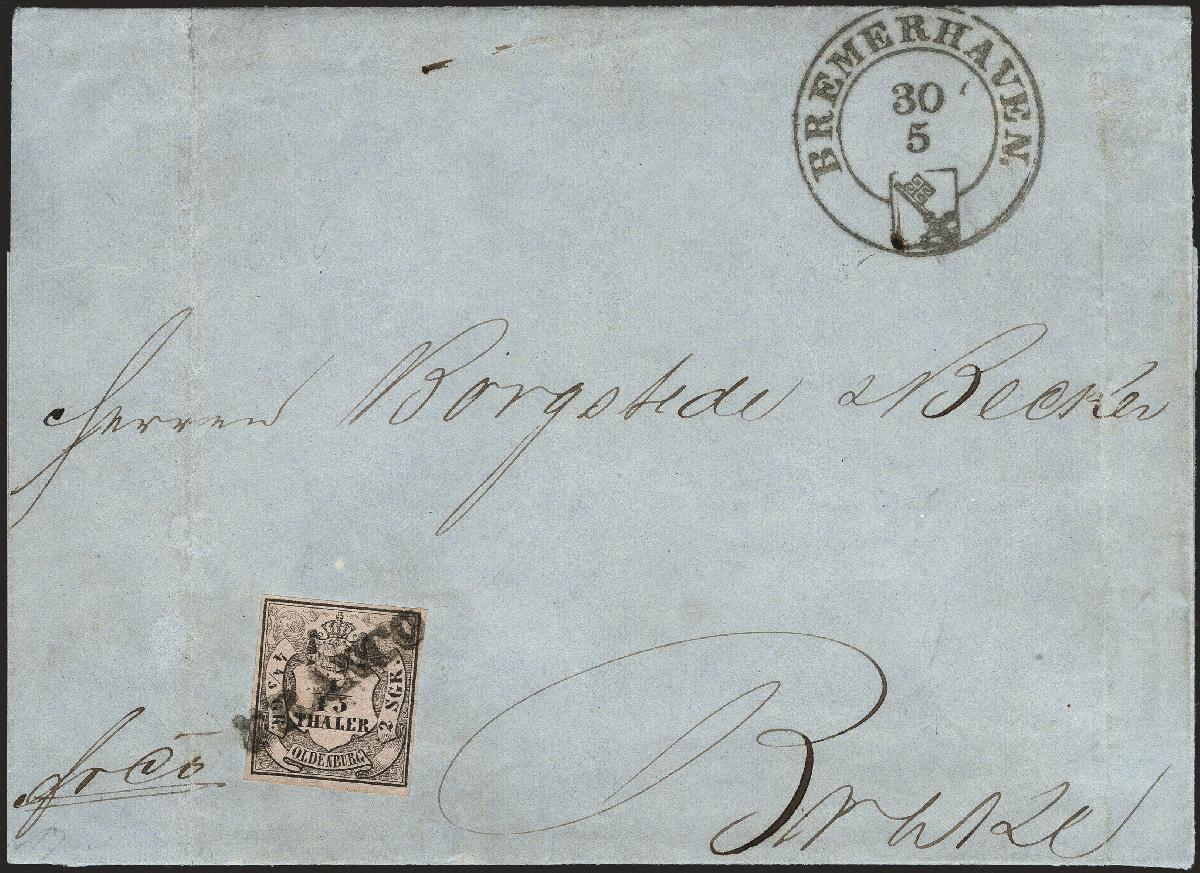 | Zusatzinformationen und Suchstichworte: | 377. Auktion Heinrich Köhler 20. - 25. September 2021 Los 107 1/15 Thaler schwarz auf rosa, Type II, farbfrisch und voll- bis breitrandig mit übergehend aufgesetztem schwarzen Langstempel "FRANCO" und klar nebengesetztem Schlüsselstempel "BREMERHAVEN 30 5" auf Briefhülle der 2. Gewichtsstufe nach Brake. Das Briefpapier in den Faltungen teils gestützt, sonst einwandfreie und attraktive Erhaltung. Ein seltener Brief des Auslandspostamtes. Signiert Krüger, Berlin und Kruschel, Fotoattest Stegmüller BPP (2021) Ausruf 500,00 EUR Zuschlag 2.400,00 EUR (aus der Sammlung Erivan Haub) |