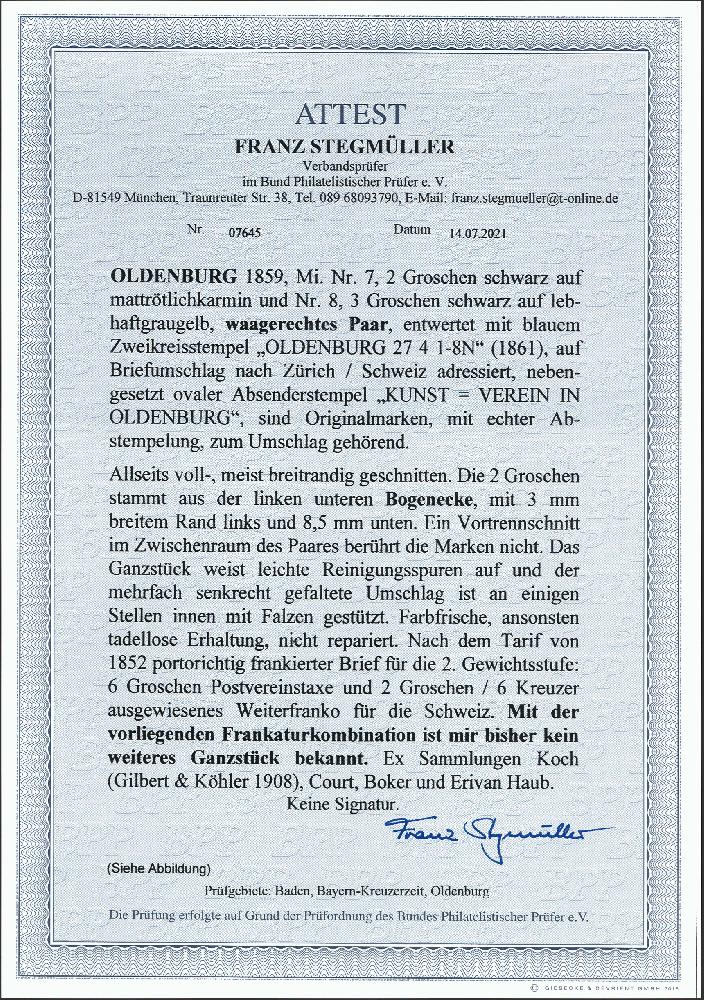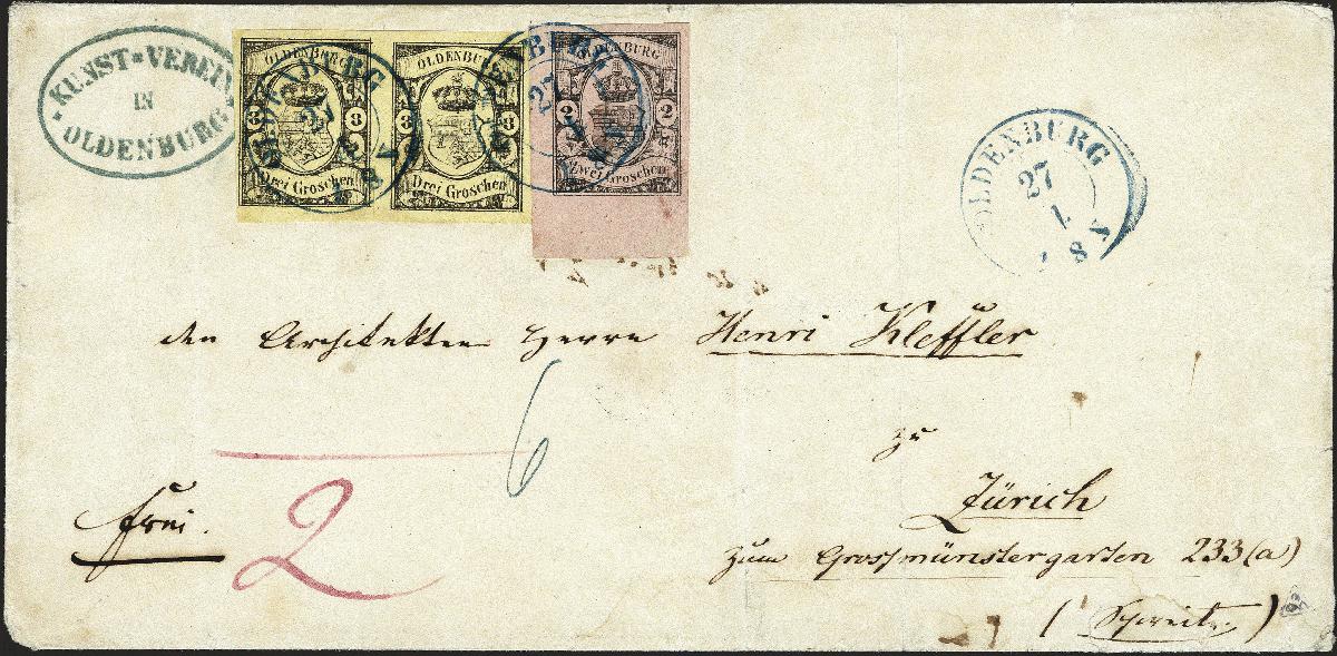 | Zusatzinformationen und Suchstichworte: | 377. Auktion Heinrich Köhler 20. - 25. September 2021 Los 111 1859, 2 Groschen schwarz auf mattrötlichkarmin, allseits breitrandige linke untere Bogenecke mit 3/8,5 mm Bogenrändern zusammen mit waagerechtem Paar 3 Groschen schwarz auf lebhaftgraugelb, voll- bis breitrandig, mit sauber auf- und nebengesetztem blauen Doppelkreisstempel "OLDENBURG 27 1" (1861) auf Briefkuvert der 2. Gewichtsstufe mit Absenderstempel des Kunstvereins in Oldenburg nach Zürich mit Durchgangsstempel von Frankfurt a.M. und Ankunftsstempel. Die Frankatur ist farbfrisch und tadellos, im Kuvert senkrechte Faltungen und leichte Reinigungsspuren. Ein äußerst seltener Auslandsbrief der 2. Ausgabe, portogerecht frankiert mit 6 Groschen Vereinsporto und 2 Groschen (= 6 Kreuzern) ausgewiesenem Weiterfranko. Eine einmalige Frankaturkombination. Fotoattest Stegmüller BPP (2021) Ausruf 20.000,00 EUR Zuschlag 42.000,00 EUR (aus der Sammlung Erivan Haub) |