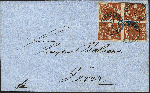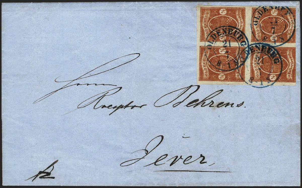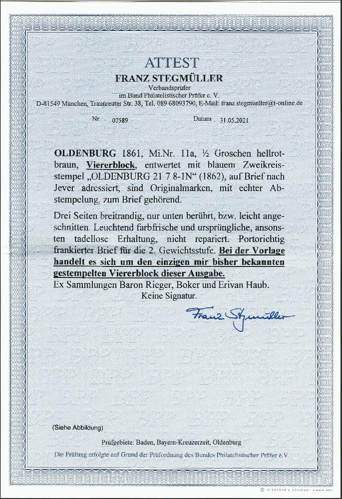 | Zusatzinformationen und Suchstichworte: | 377. Auktion Heinrich Köhler 20. - 25. September 2021 Los 112 1861, Staatswappen auf weißem Papier ½ Groschen hellrotbraun im 4er-Block, schöne frische leuchtende Farbe, unten etwas berührt bzw. leicht angeschnitten, sonst allseits breitrandig, mit dreimal sauber aufgesetztem blauen Doppelkreisstempel "OLDENBURG 21/7" (1862) auf komplettem Faltbrief der 2. Gewichtsstufe nach Jever. Schöne ursprüngliche und frische Erhaltung. Dieser Brief stellt eine der großen Seltenheiten der Oldenburg-Philatelie dar. Es handelt sich hier um den einzigen registrierten gestempelten 4er-Block der gesamten 3. Ausgabe und den einzigen 4er-Block aller geschnittenen Ausgaben auf Brief. Fotoattest Stegmüller BPP (2021) Ausruf 10.000,00 Zuschlag 29.000,00 EUR (aus der Sammlung Erivan Haub) |