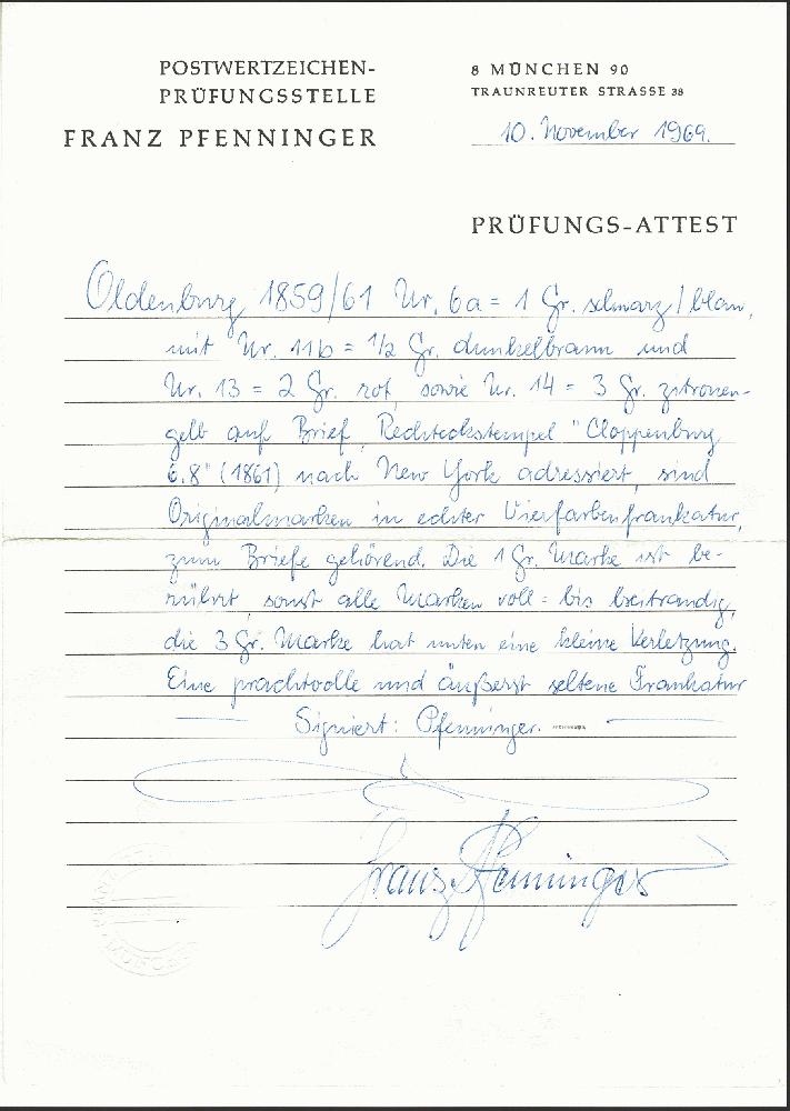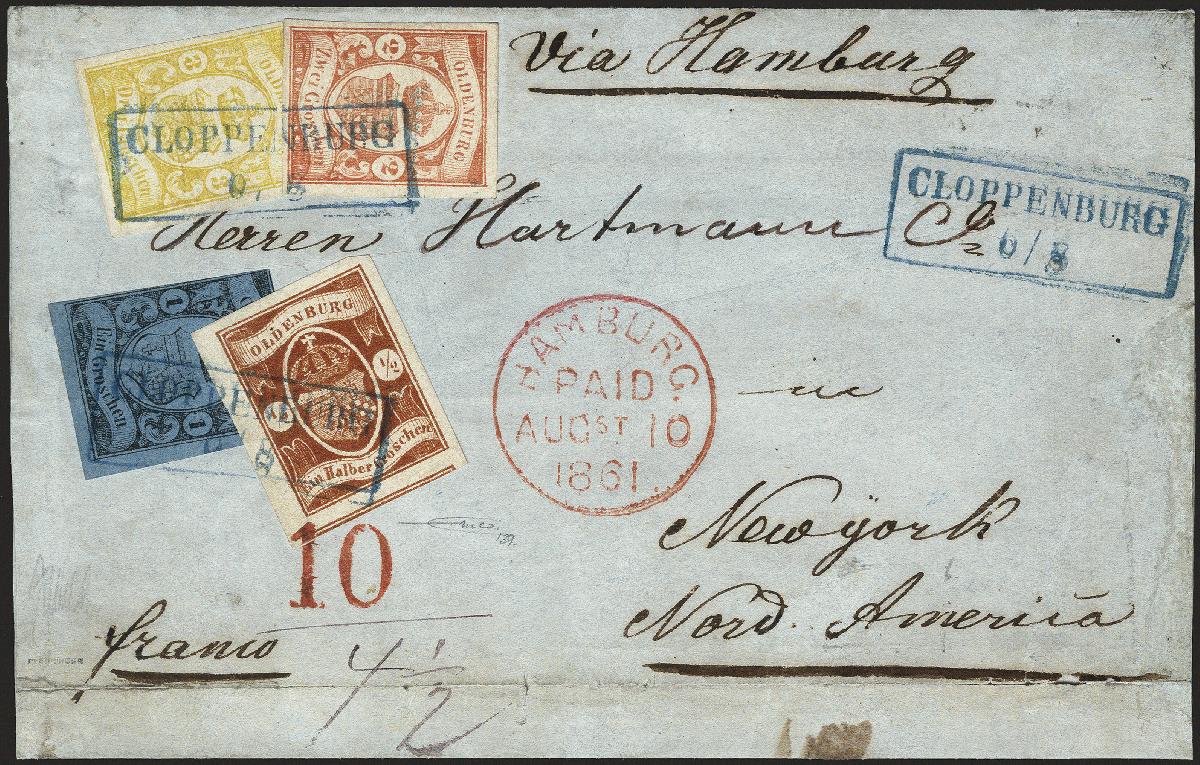 | Zusatzinformationen und Suchstichworte: | 377. Auktion Heinrich Köhler 20. - 25. September 2021 Los 113 Staatswappen auf weißem Papier ½ Groschen orangebraun, 2 Groschen dunkelzinnober und 3 Groschen gelb in Mischfrankatur mit 1859, Staatswappen auf farbigem Papier 1 Silbergroschen schwarz auf blau, alle Werte farbfrisch, die 1 Groschen teils berührt bzw. leicht angeschnitten, die 3 Groschen oben berührt, sonst alle voll- bis breitrandig, die ½ Groschen überrandig mit Teil der Nachbarmarke unten, mit sauber auf- und nebengesetztem Rahmenstempel "CLOPPENBURG 6/8" (1861) auf Briefhülle (seitliche Rückklappen fehlend) mit vorderseitigem roten "HAMBURG PAID AUGST 10 1861" nach New York mit nebengesetztem roten Taxstempel "10" (leicht auf die ½ Groschen übergehend). Die Briefhülle ist rückseitig teils gestützt, unten verläuft ein scharfer waagerechter Bug (teils getrennt); der Name in der Adresse war herausgeschnitten, hier hinterlegt und nachgemalt. Eine altbekannte und sehr attraktive, einmalige Farbfrankatur der 2. und 3. Ausgabe. Trotz der erwähnten Unzulänglichkeiten ein herausragendes Stück der Oldenburg-Philatelie. Signiert Jakubek (EMCO) und Pfenninger mit Attest (1969) und Fotoattest Stegmüller BPP (2021) Ausruf 10.000,00 EUR Zuschlag 10.000,00 EUR (aus der Sammlung Erivan Haub) |