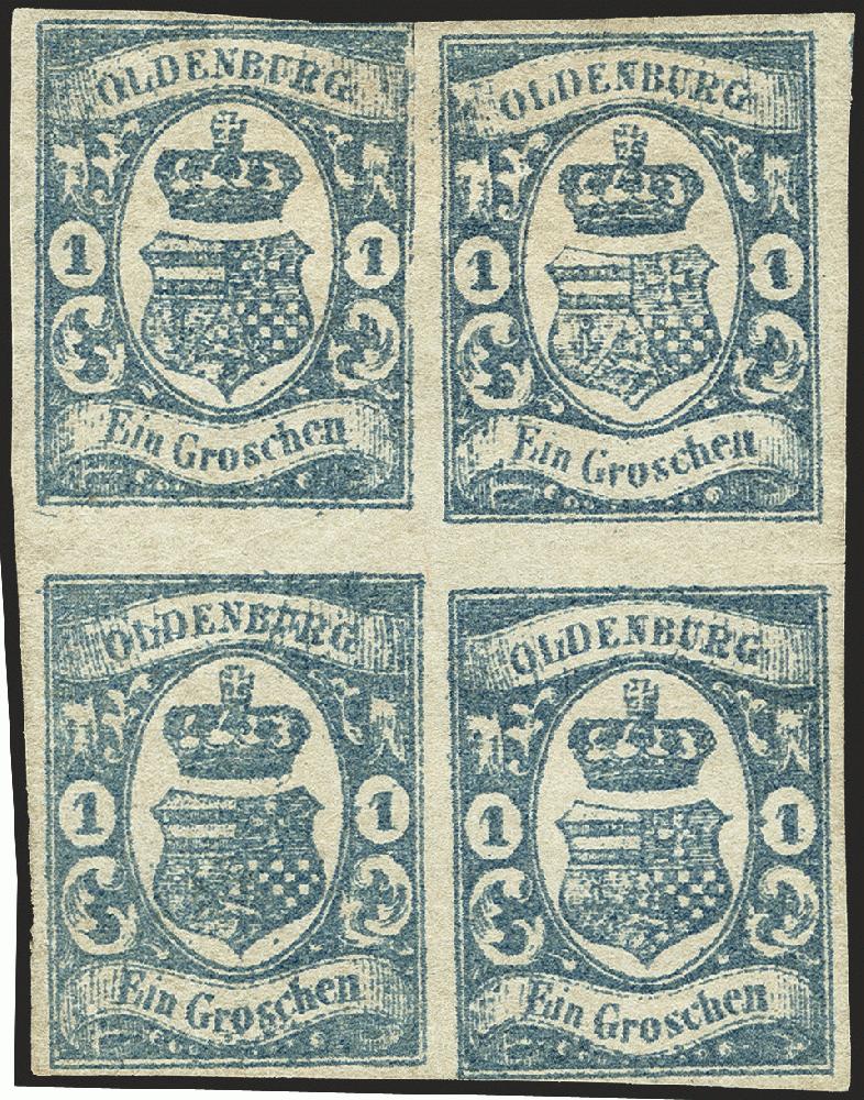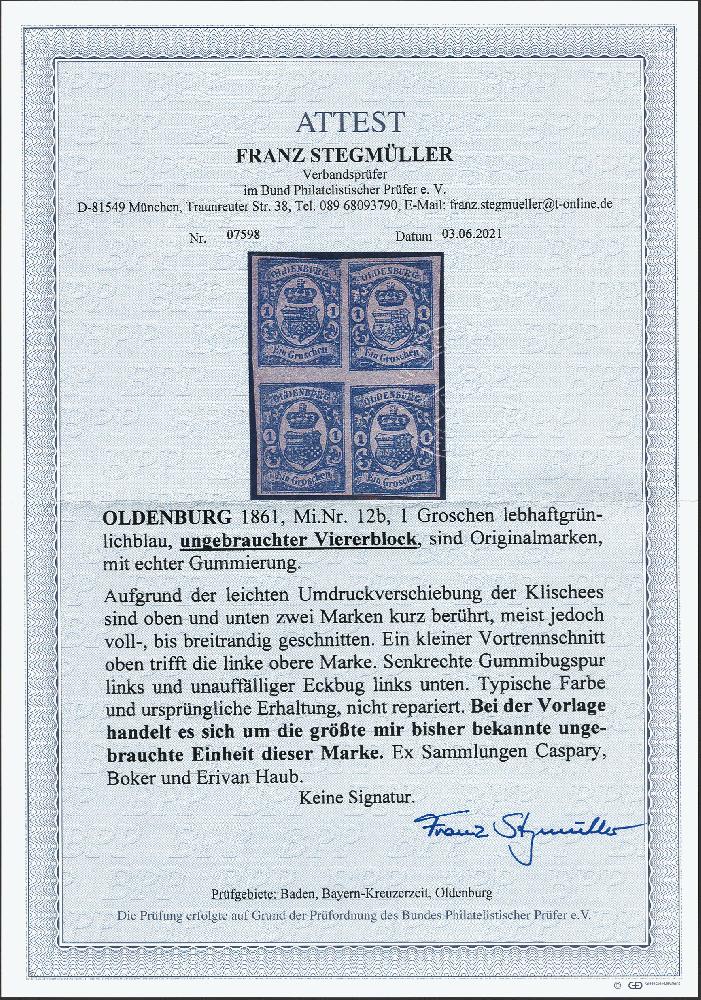 | Zusatzinformationen und Suchstichworte: | 377. Auktion Heinrich Köhler 20. - 25. September 2021 Los 114 1861, Staatswappen auf weißem Papier 1 Groschen lebhaftgrünlichblau im 4er-Block, sehr schön farbfrisch, aufgrund einer deutlichen Klischeeversetzung 2 Werte kurz minimal berührt (einer auch kleiner Vortrennschnitt), sonst alle voll- bis breitrandig, ungebraucht mit Originalgummi. Das linke Paar senkrechte Gummibugspur und unauffälliger kleiner Eckbug unten, sonst in einwandfreier und ursprünglicher Erhaltung. Eine der großen Ungebraucht-Seltenheiten Oldenburgs; einzig registrierte Blockeinheit der 1 Groschen-Marke und darüber hinaus größte registrierte Einheit der 'trübblauen' Nuance. Fotoattest Stegmüller BPP (2021) Ausruf 10.000,00 EUR Zuschlag 17.000,00 EUR (aus der Sammlung Erivan Haub) |