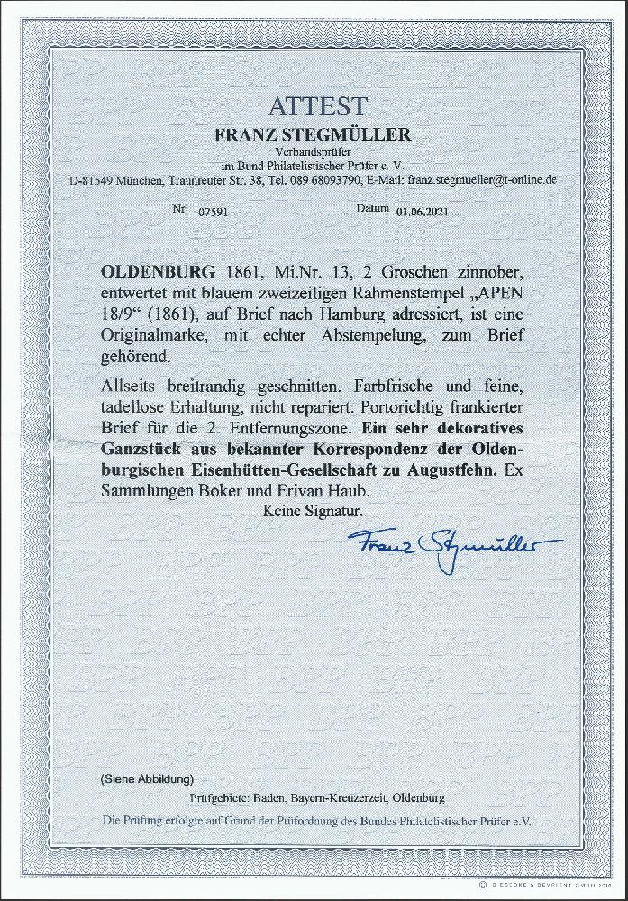 | Zusatzinformationen und Suchstichworte: | 377. Auktion Heinrich Köhler 20. - 25. September 2021 Los 115 2 Groschen zinnober in schöner tiefer Farbe und allseits breitrandig, mit sauber auf- und nebengesetztem kleinen Rahmenstempel "APEN 16/9" (1861) auf Faltbrief (Inhalt nicht ganz komplett) mit nebengesetztem Absenderstempel der "OLDENBURGISCHEN EISENHÜTTEN-GESELLSCHAFT ZU AUGUSTFEHN" nach Hamburg mit Ankunftsstempel des Hannoverschen Postamtes. Eine attraktive Einzelfrankatur in tadelloser Erhaltung. Fotoattest Stegmüller BPP (2021) Ausruf 500,00 EUR Zuschlag 1.300,00 EUR (aus der Sammlung Erivan Haub) |