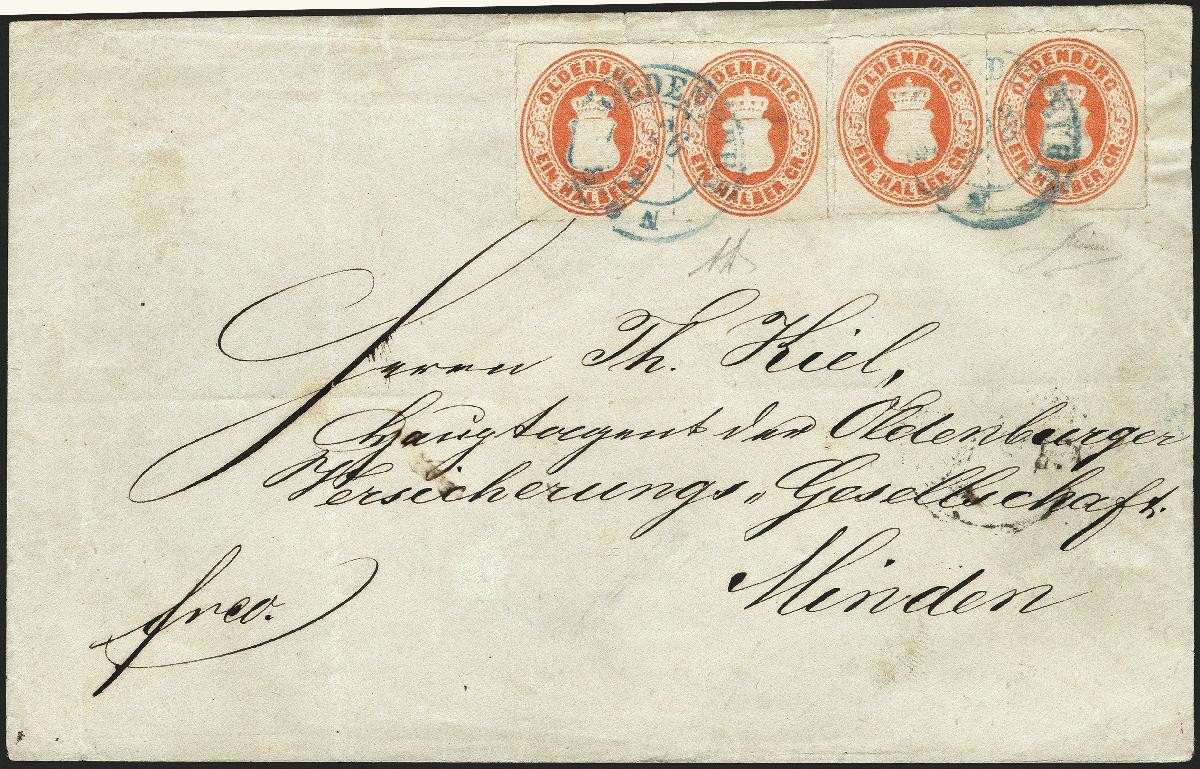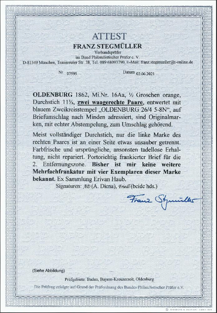 | Zusatzinformationen und Suchstichworte: | 377. Auktion Heinrich Köhler 20. - 25. September 2021 Los 116 1862, Ovalausgabe ½ Groschen orange, durchstochen 11 3/4, zwei waagerechte Paare, farbfrisch und bis auf geringen Durchstichmangel an einer Stelle einwandfrei, mit blauem Doppelkreisstempel "OLDENBURG 26/4" auf Briefkuvert an die Hauptagentur der Oldenburger Versicherungs-Gesellschaft in Minden mit rückseitigem Ausgabestempel. Im Kuvert oben kleine Einrisse und leichte Faltungen außerhalb der Frankatur, sonst tadellose Erhaltung. Größte Mehrfachfrankatur dieser Marke, wir haben keine weitere registriert. Signiert Friedl und Alberto Diena, Fotoattest Stegmüller BPP (2021) Ausruf 1.000,00 EUR Zuschlag 5.800,00 EUR (aus der Sammlung Erivan Haub) |