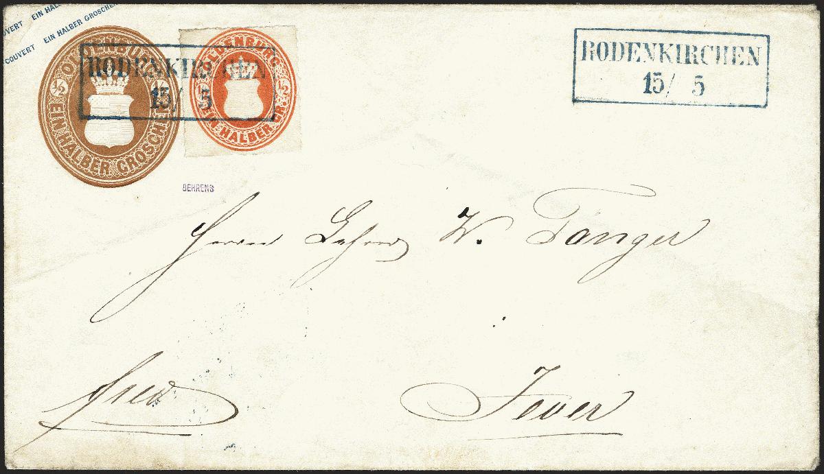 | Zusatzinformationen und Suchstichworte: | 377. Auktion Heinrich Köhler 20. - 25. September 2021 Los 118 1861/62, Umschlag ½ Groschen hellbraun im Kleinformat mit Zufrankatur 1862, Ovalausgabe ½ Groschen orange, farbfrisch und gut durchstochen, mit klar auf- und nebengesetztem Rahmenstempel "RODENKIRCHEN 15/5" nach Jever. Der Umschlag außerhalb der Frankatur bügig, sonst tadellose und attraktive Erhaltung. Eine seltene Kombination, von der nur 3 weitere Belege registriert sind. Signiert Behrens und Fotoattest Stegmüller BPP (2021) Ausruf 2.000,00 EUR Zuschlag 8.000,00 EUR (aus der Sammlung Erivan Haub) |