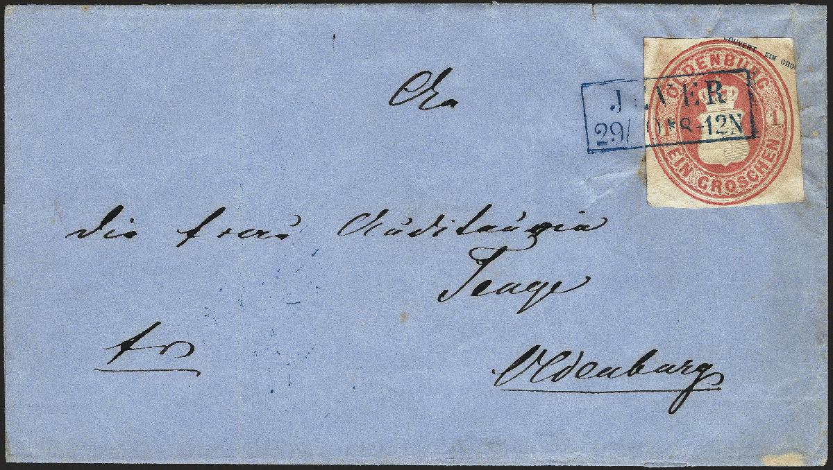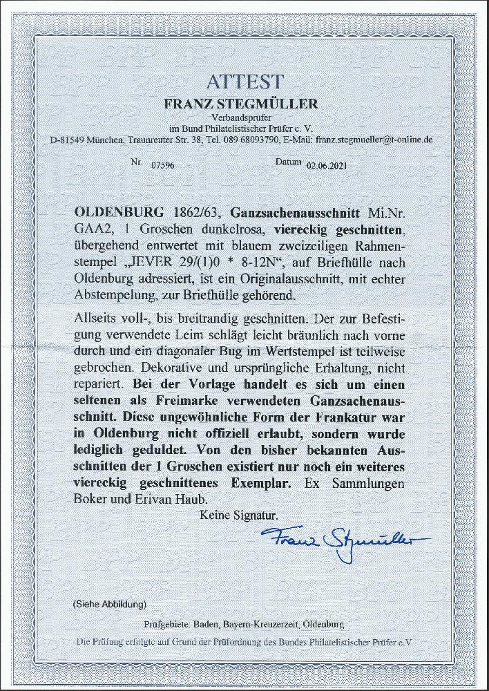 | Zusatzinformationen und Suchstichworte: | 377. Auktion Heinrich Köhler 20. - 25. September 2021 Los 120 1862/63, Ganzsachenausschnitt 1 Groschen dunkelrosa, voll- bis breitrandig viereckig geschnitten mit sauber aufgesetztem Rahmenstempel "JEVER 29/10" auf Briefhülle nach Oldenburg, portogerecht frankiert für einen Brief in der 1. Entfernungszone. Der zum befestigen verwendete Leim schlägt nach vorne leicht bräunlich durch, ein ganz unauffälliger diagonaler Bug im Wertstempel ist in der Mitte gering gebrochen, sonst einwandfreie und ursprüngliche Erhaltung. Die Verwendung von Ganzsachenausschnitten war in Oldenburg nicht offiziell erlaubt und ist dementsprechend selten, vom 1 Groschen-Wert haben wir nur 2 weitere viereckig geschnittene Stücke auf Brief registriert. Fotoattest Stegmüller BPP (2021) Ausruf 3.000,00 EUR (aus der Sammlung Erivan Haub) |