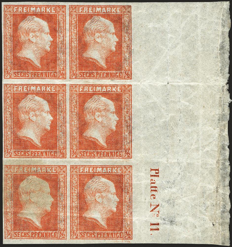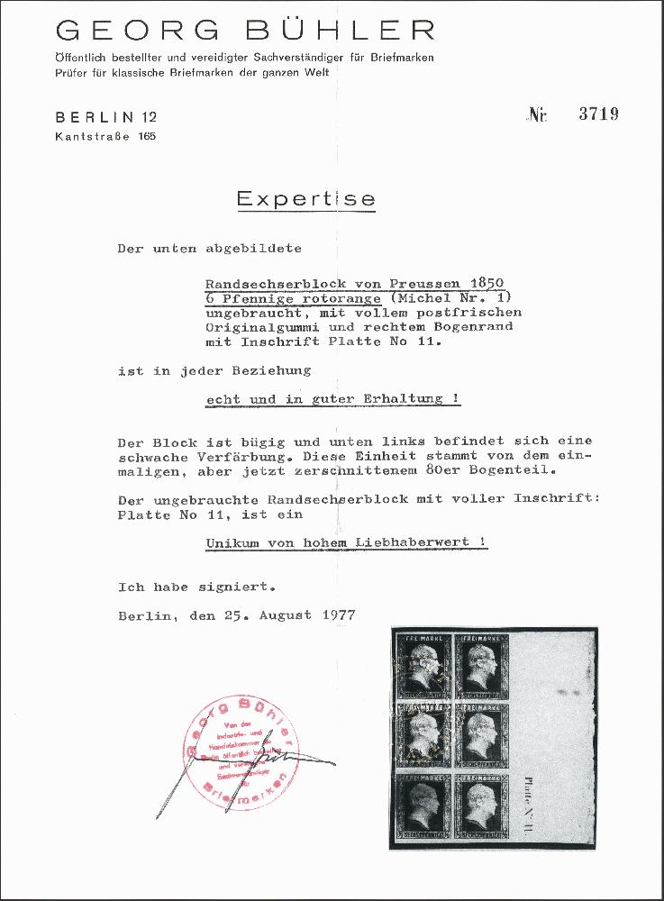| Zusatzinformationen und Suchstichworte: | 377. Auktion Heinrich Köhler 20. - 25. September 2021 Los 122 ½ Silbergroschen rotorange im senkrechten 6er-Block vom rechten Bogenrand mit vollständiger Randinschrift "Platte No.11.". Die Einheit ist farbfrisch und voll- bis breitrandig, rechts ca. 28 mm Bogenrand mit Teil des Randwasserzeichens "DER", ungebraucht mit Originalgummi, das mittlere Paar postfrisch. Die Einheit ist zwischen den Marken vorgefaltet und hat zusätzlich im unteren Paar sowie im breiten Bogenrand Büge, sonst bis auf eine kleine Verfärbung bei der linken unteren Marke einwandfrei. Eine außerordentlich seltene Einheit. Signiert Georg Bühler mit Fotoattest (1977) und Jakubek, Fotoattest Jäschke-L. BPP (2021) Ausruf 2.000,00 EUR Zuschlag 15.000,00 EUR (aus der Sammlung Erivan Haub) |