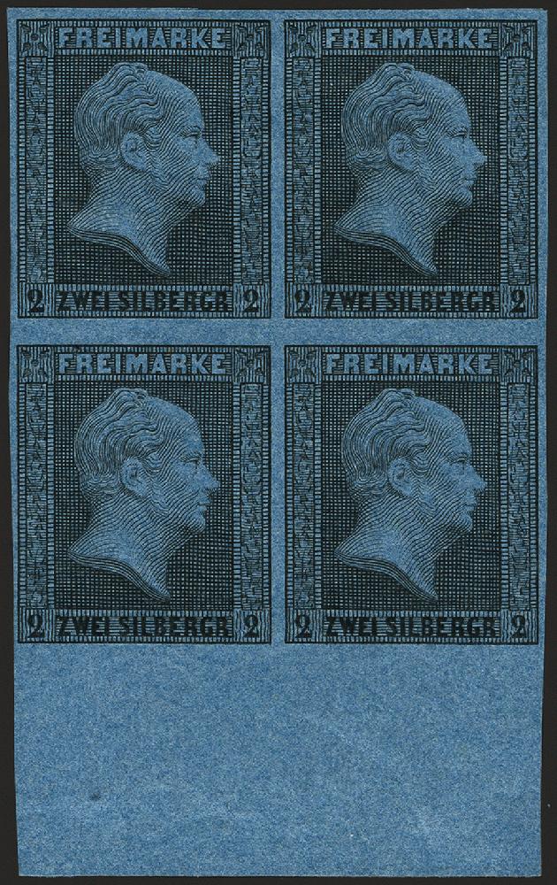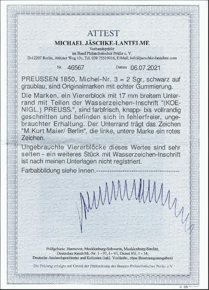 | Zusatzinformationen und Suchstichworte: | 377. Auktion Heinrich Köhler 20. - 25. September 2021 Los 123 2 Silbergroschen schwarz auf graublau im Unterrand-4er-Block; sehr schön farbfrisch und voll- bis breitrandig, unten mit ca. 17 mm Bogenrand mit Wasserzeichen-Inschrift "PREUSS.-", ungebraucht mit Originalgummi, tadellos, signiert Kurt Maier, Berlin und Fotoattest Jäschke-L. BPP (2021) Ausruf 800,00 EUR Zuschlag 1.000,00 EUR (aus der Sammlung Erivan Haub) |