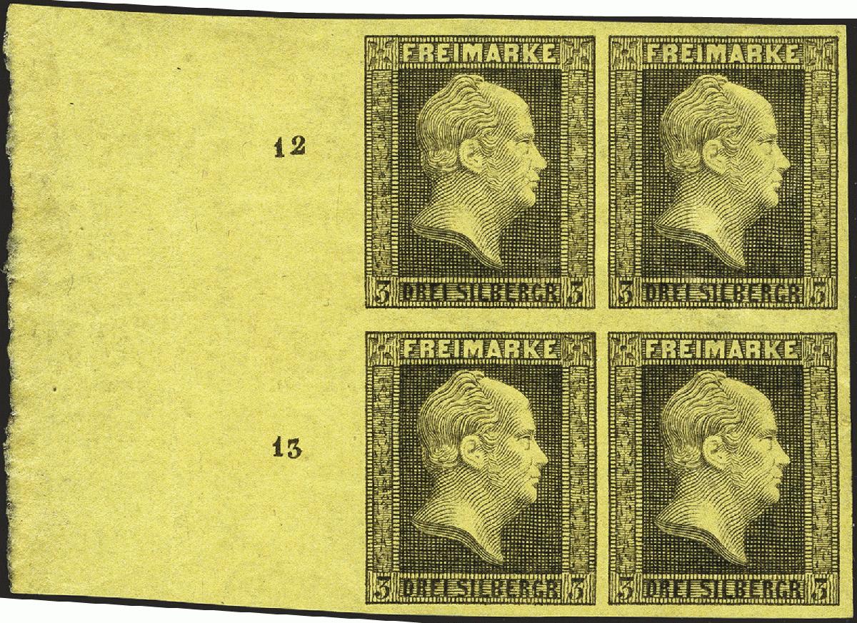 | Zusatzinformationen und Suchstichworte: | 377. Auktion Heinrich Köhler 20. - 25. September 2021 Los 124 3 Silbergroschen schwarz auf gelb im 4er-Block vom linken Bogenrand, sehr schöne leuchtend frische Farbe und allseits breitrandig, links mit ca. 28 mm Bogenrand mit Reihenzählern "12" und "13", ungebraucht mit Originalgummi, die rechte untere Marke postfrisch; die rechten Werte minimalst fleckig, sonst tadellose und sehr frische Erhaltung. Fotoattest Jäschke-L. BPP (2021) Ausruf 1.000,00 EUR Zuschlag 1.450,00 EUR (aus der Sammlung Erivan Haub) |