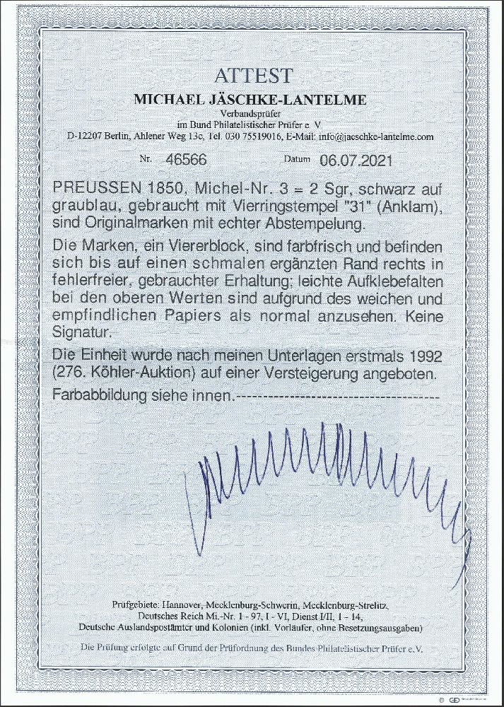 | Zusatzinformationen und Suchstichworte: | 377. Auktion Heinrich Köhler 20. - 25. September 2021 Los 138 2 Silbergroschen schwarz auf blau im 4er-Block, dreiseitig voll- bis überrandig, der rechte Rand ergänzt, sauber entwertet mit Nummer "31" ANKLAM, sonst einwandfrei. Fotoattest Jäschke-L. BPP (2021) Ausruf 200,00 EUR Zuschlag 520,00 EUR (aus der Sammlung Erivan Haub) |