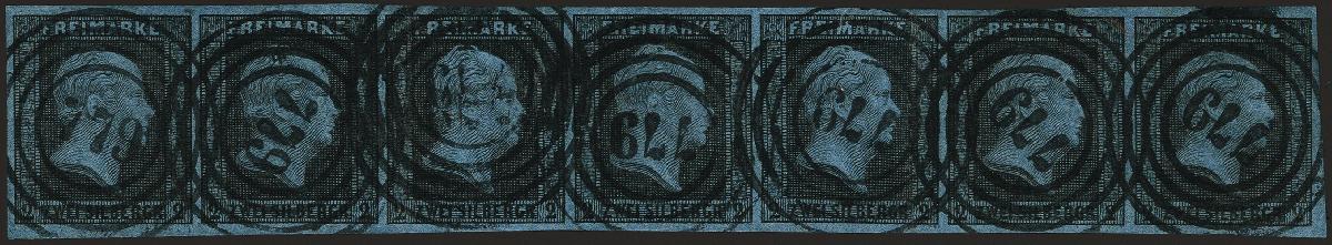 | Zusatzinformationen und Suchstichworte: | 377. Auktion Heinrich Köhler 20. - 25. September 2021 Los 140 2 Silbergroschen scharz auf blau im waagerechten 7er-Streifen, farbfrisch und gleichmäßig breitrandig geschnitten, jeder Wert sauber entwertet durch Nummer "779" LABIAU. Die 3. und 5. Marke von links mit geglätteter senkrechter Bugspur, letztere oben mit kleinem Einriß, sonst einwandfrei. Ein attraktiver und sehr seltener Streifen, zweitgrößte registrierte Streifeneinheit dieser Marke. Fotoattest Jäschke-L. BPP (2021) Ausruf 2.000,00 EUR Zuschlag 5.400,00 EUR (aus der Sammlung Erivan Haub) |